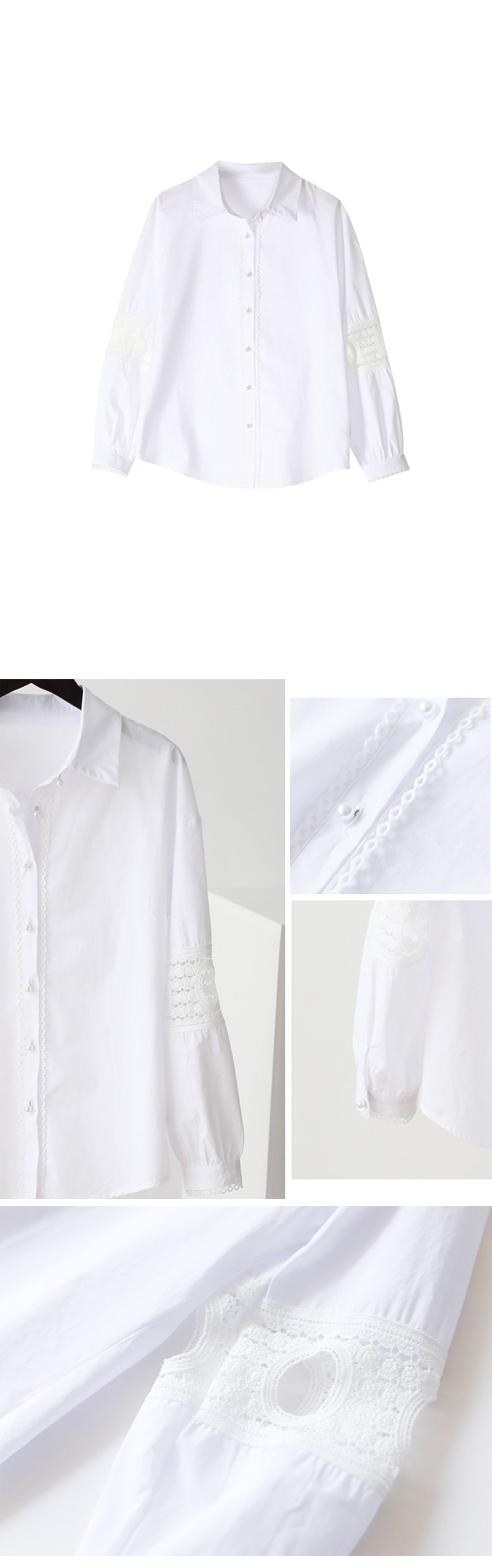 ステンカラー、カットワークレース切替、シエルステッチ施し、バックヨーク、センターボックス、前開きパールボタン、カフスボタン付き、長袖、無地 |