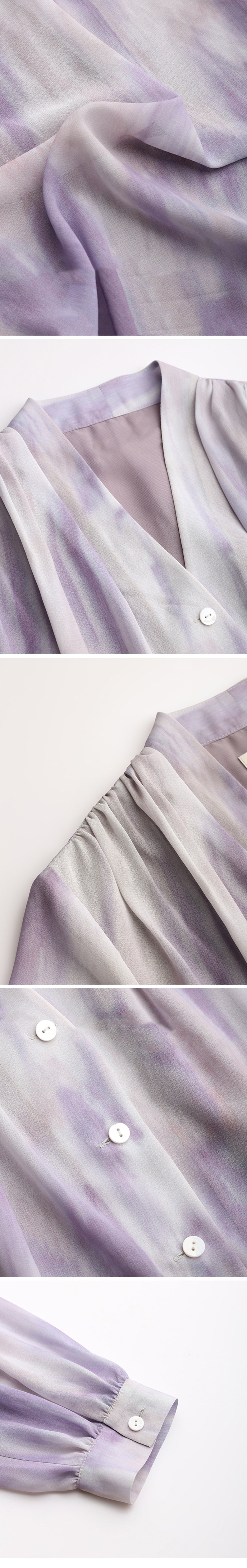 Vネック、肩にギャザー寄せ、前開きボタン、カフスにボタンあり、オンブレデザイン、長袖 |