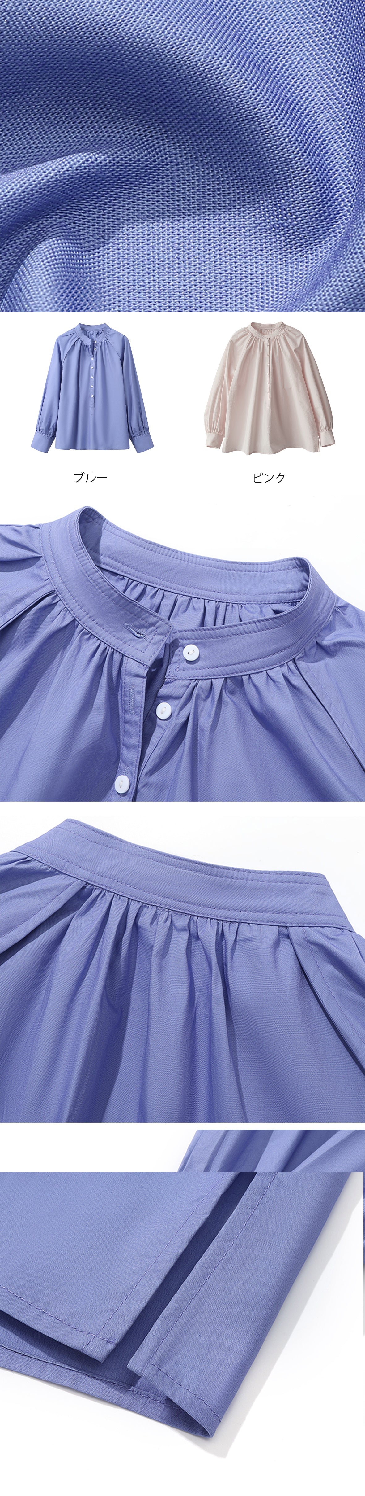 スタンドカラー、前開きボタン、ラグランスリーブ、パフスリーブ、ギャザー寄せ、カフスにボタンあり、サイドスリット、無地、長袖 |