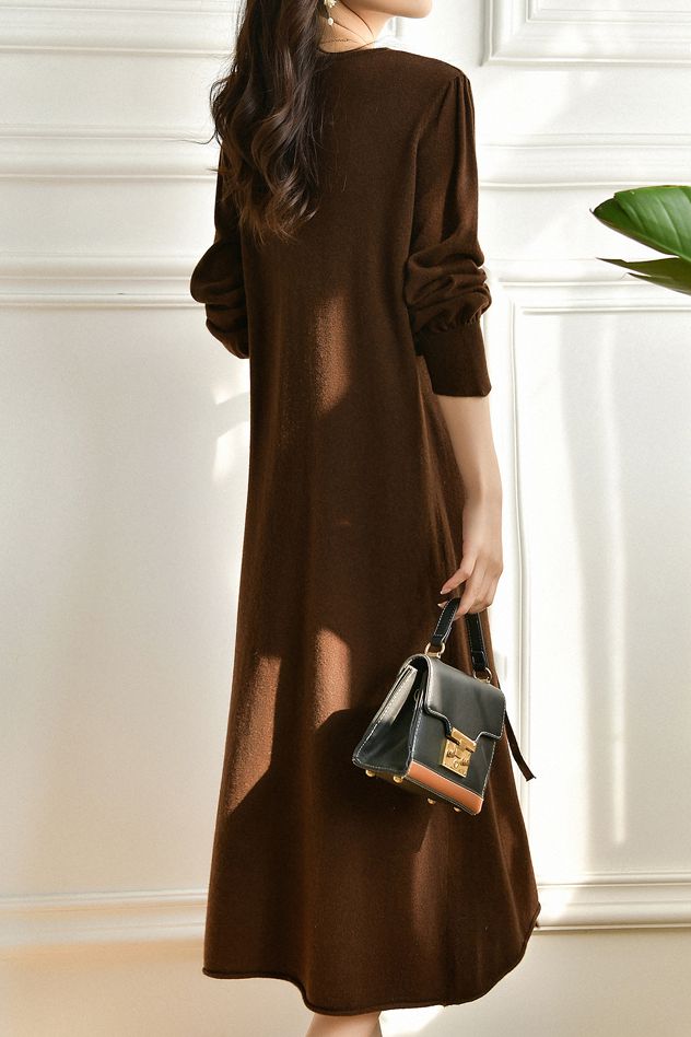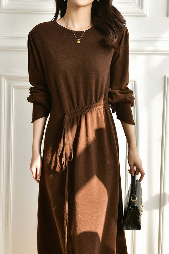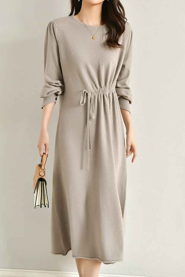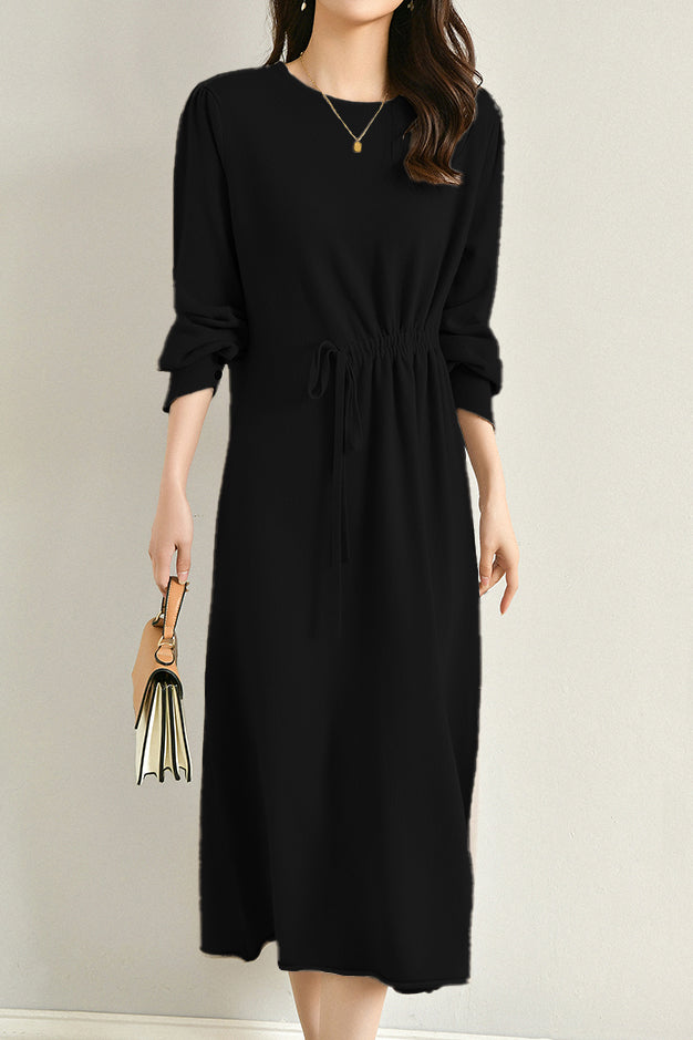 Dress, Crew Neck Long Sleeves, Waist Cinching Design on Right Side, Adjustable Drawstring, Irregular Cuff Design |