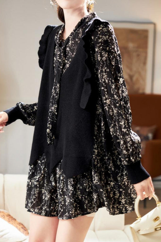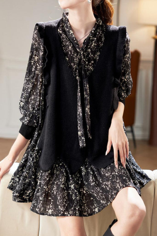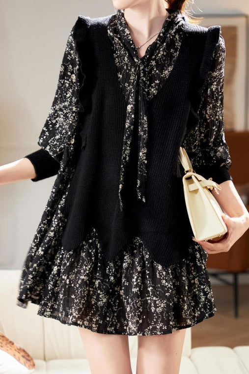 Faux Two-Piece Patchwork Floral Long Sleeve Dress