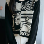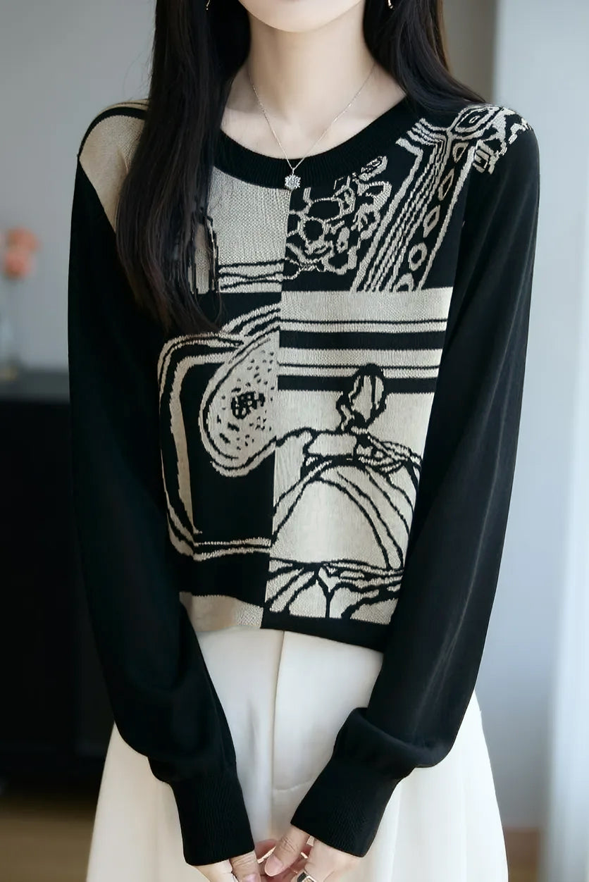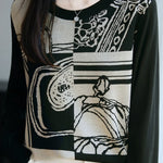 Knit top with round neck, long sleeves, color-block design, and pattern collage design |