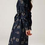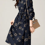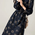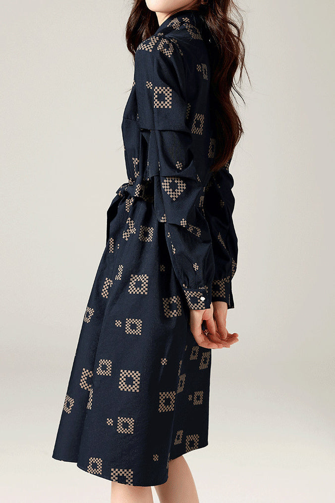 Dress with polo collar, long sleeves, hidden zipper on the right waist side, front button closure, waist-defining design, buttoned cuffs, pleated sleeves, and a matching belt accessory (random patterns) |