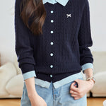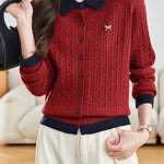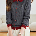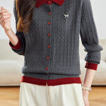 Knit cardigan with color-block collar, cuffs, and hem, front button closure, and detachable exquisite butterfly brooch on the left chest |