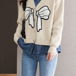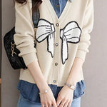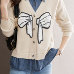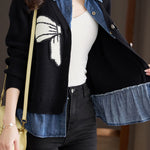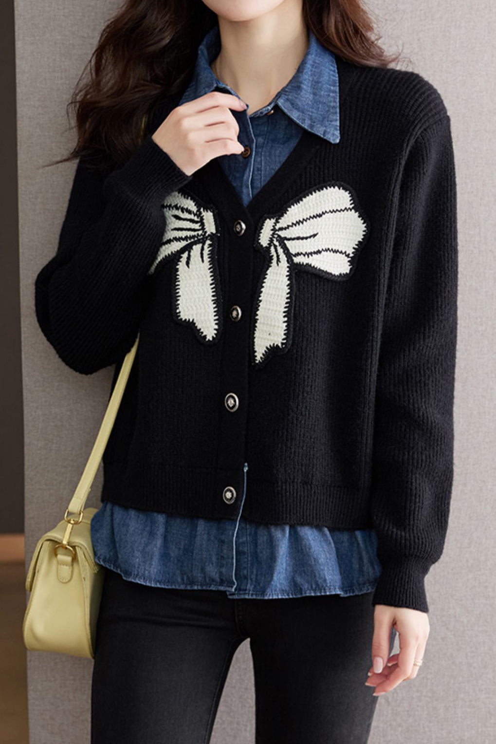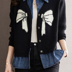 Casual Denim Patchwork Faux Layered Bow Knit Cardigan