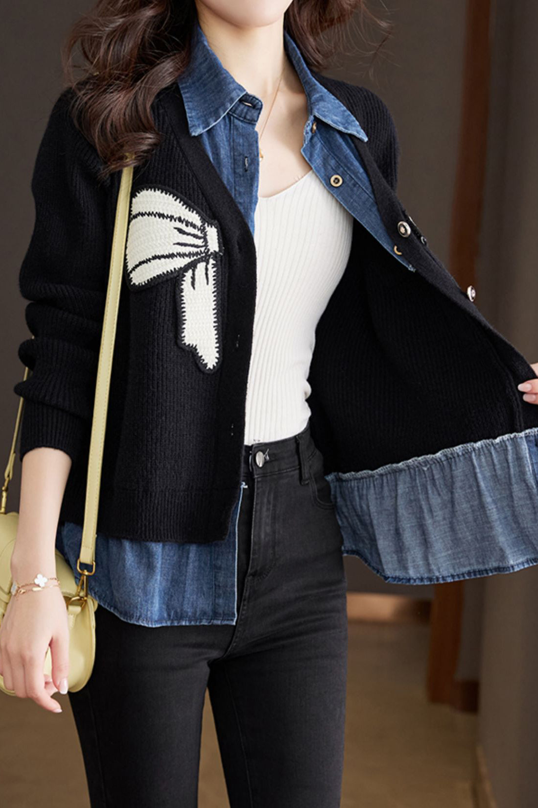 Denim Patchwork Knit Cardigan with denim fabric on the collar and hem, front button closure, loose long sleeves, and a large butterfly pattern design on the front |