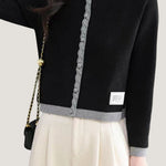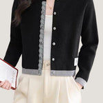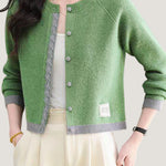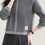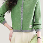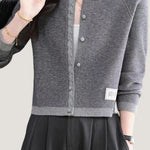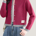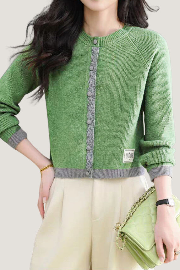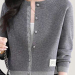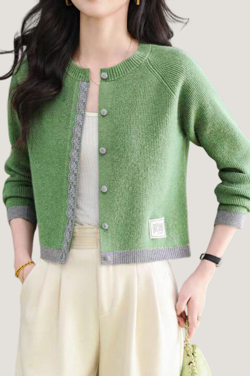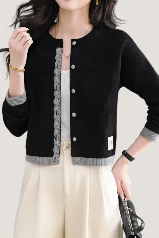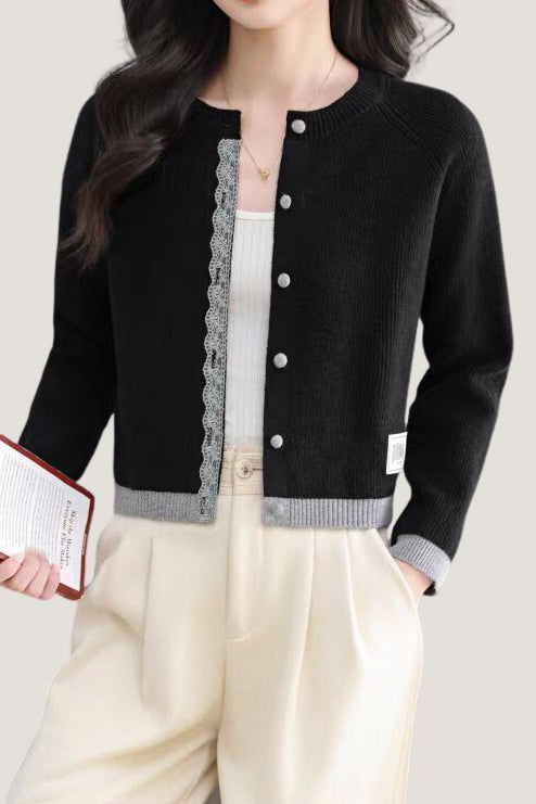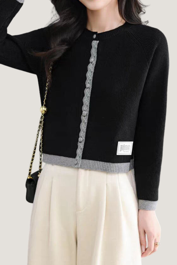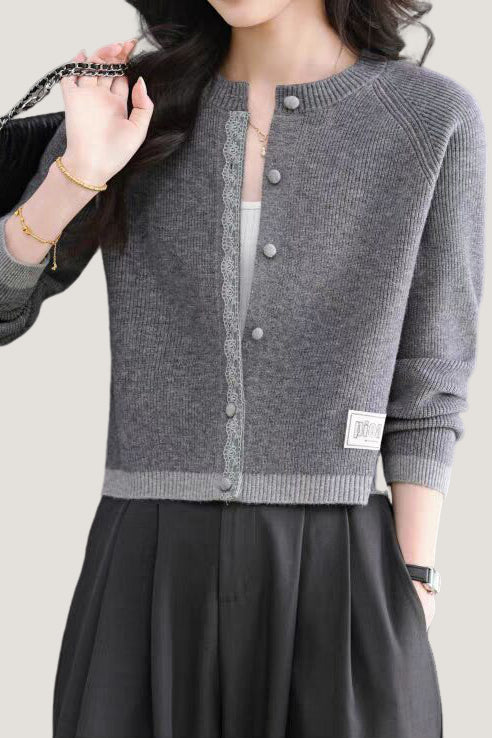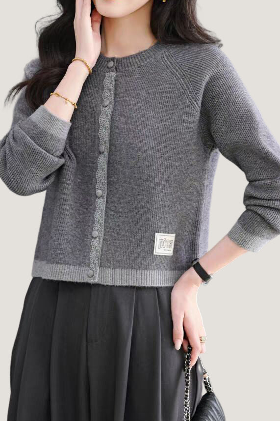 Knit cardigan with round neck, front button closure, gray lace trim on the front placket, color-block design at the hem and cuffs, and exquisite letter patch decoration on the left front hem |
