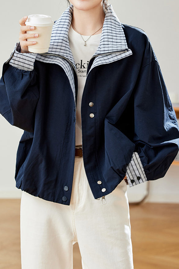 Jacket with stand collar and long sleeves, double-layer design, buttoned cuffs, front double-layer zipper, color-block design, and plaid patchwork |