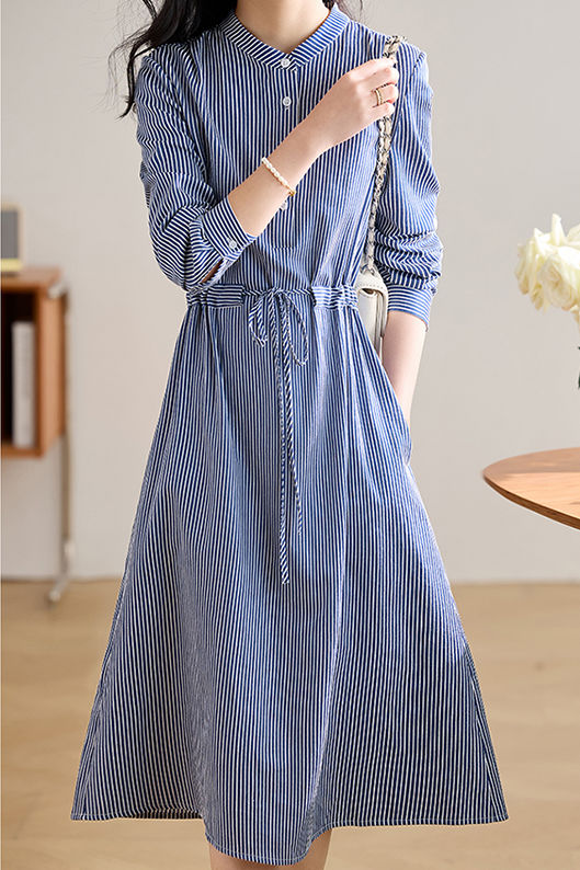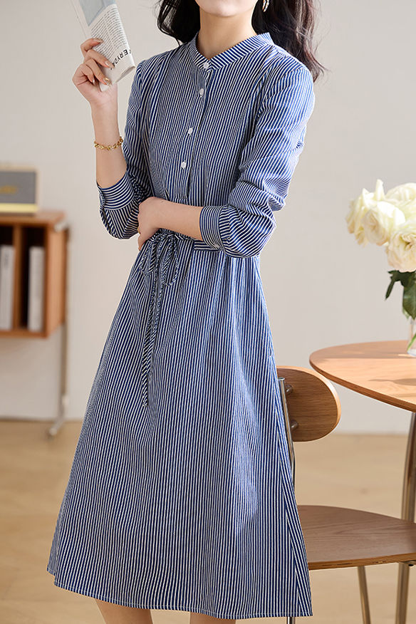 Dress,long-sleeved with stand collar,front center button closure,cuff with button closure,waist with adjustable drawstring |