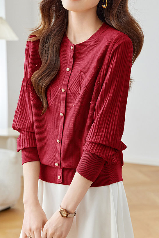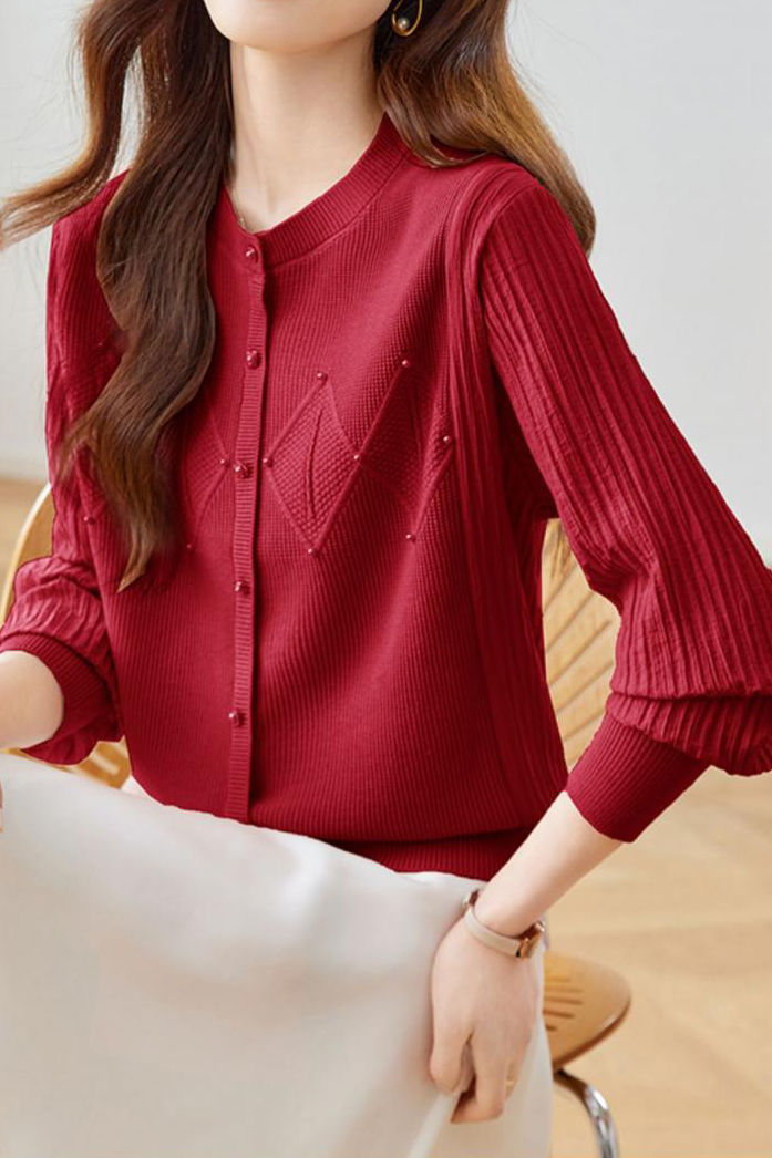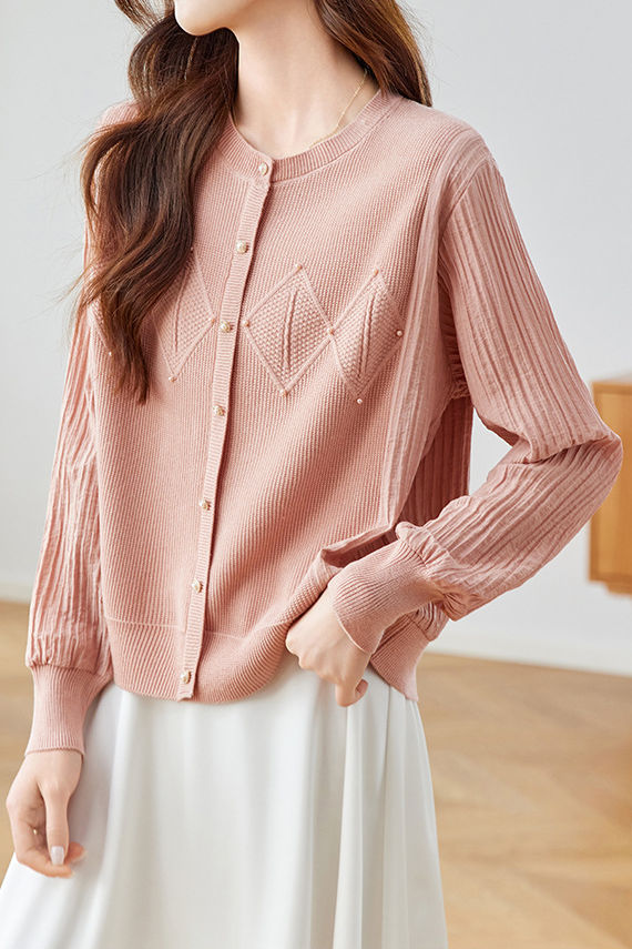 Knit Top with a round neck and long sleeves, combining knit and chiffon materials, decorative button at the front, with geometric and pearl embellishments |