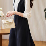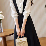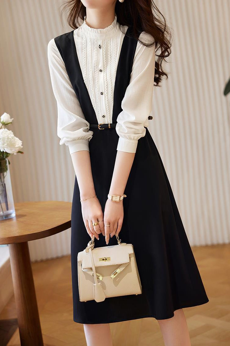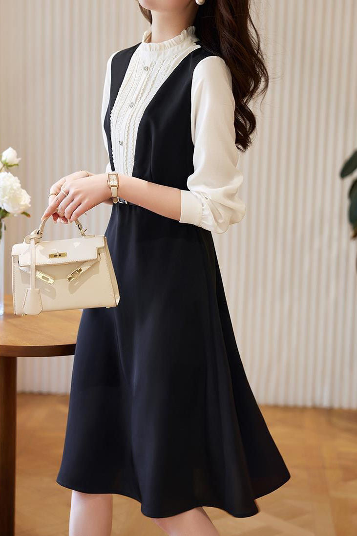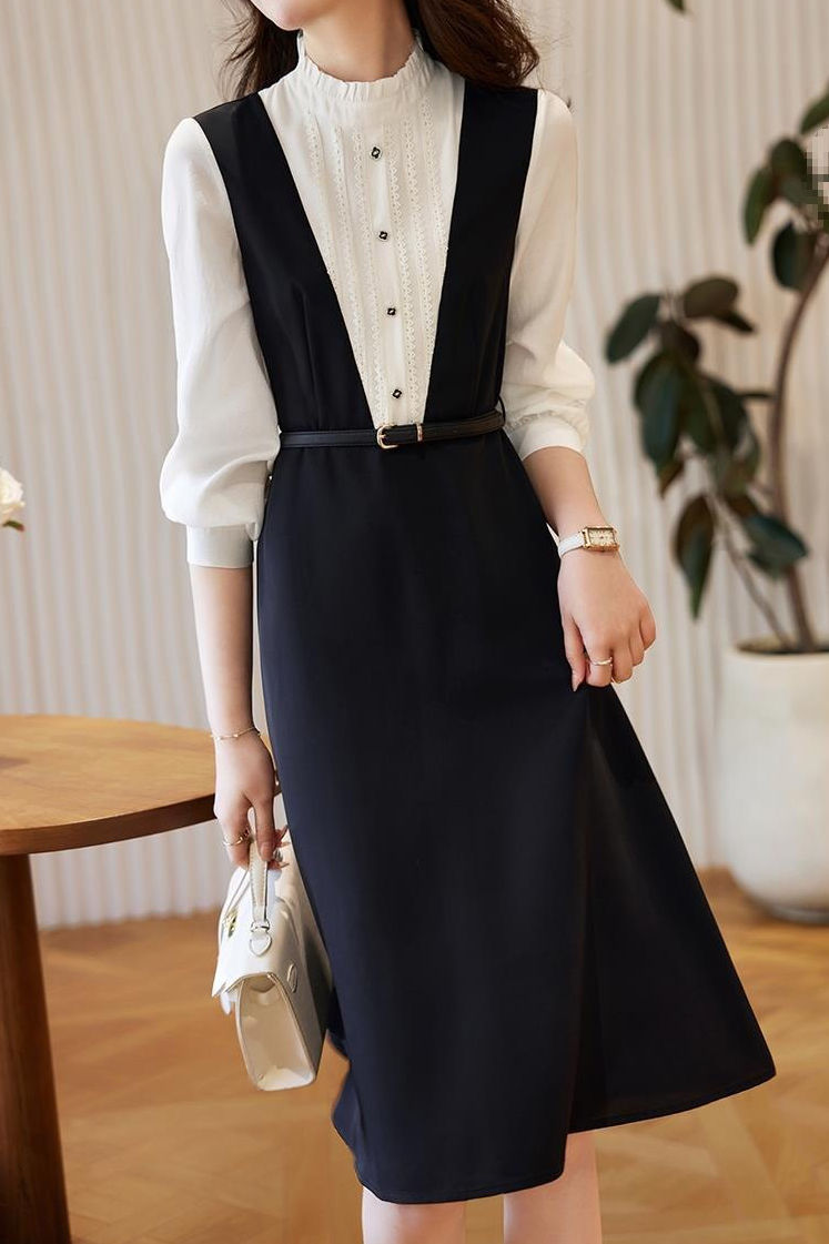 Dress with color-block patchwork design, ruffled neckline, hidden zipper at the back, decorative buttons on the faux placket, lace trim at the front neck, textured white fabric, waist-defining A-line silhouette, and detachable belt |