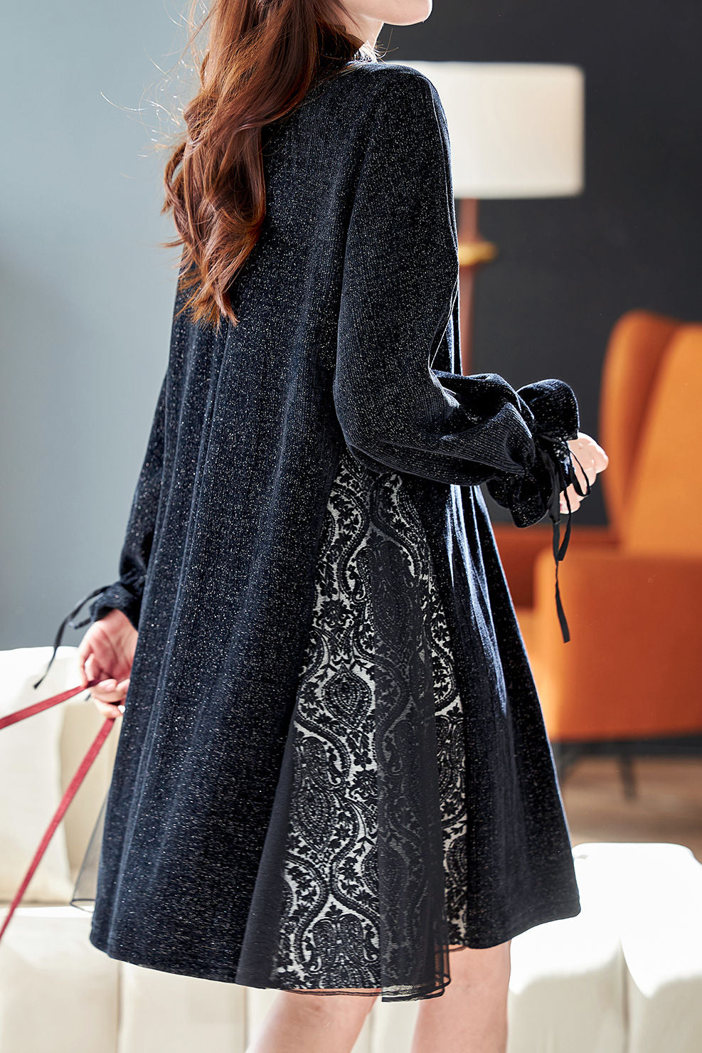 Dress with a round neck and black mesh ruffle at the neckline, hidden zipper at the back, pleats at the front, printed and mesh patchwork at the hem, printed sleeves, and bow ribbon at the cuffs |