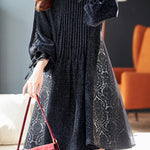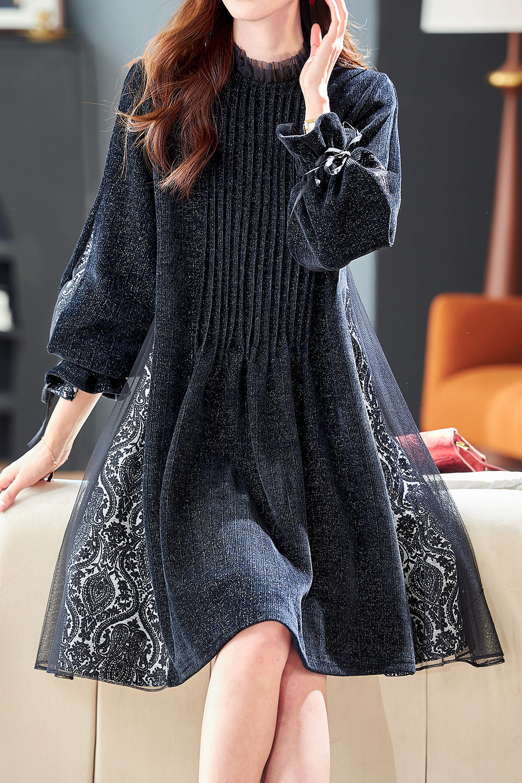 Elegant Pleated Printed Patchwork Lurex A-Line Dress