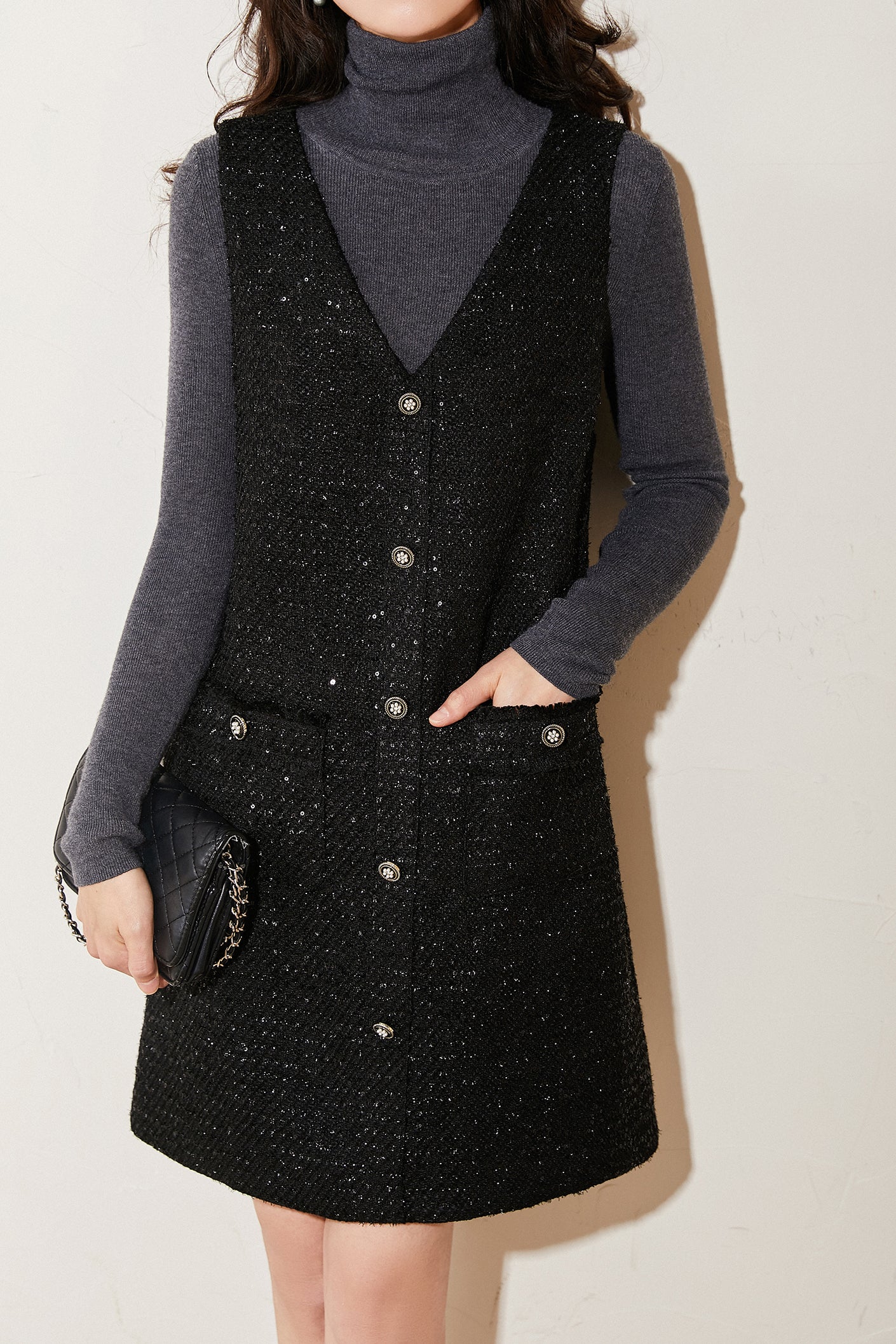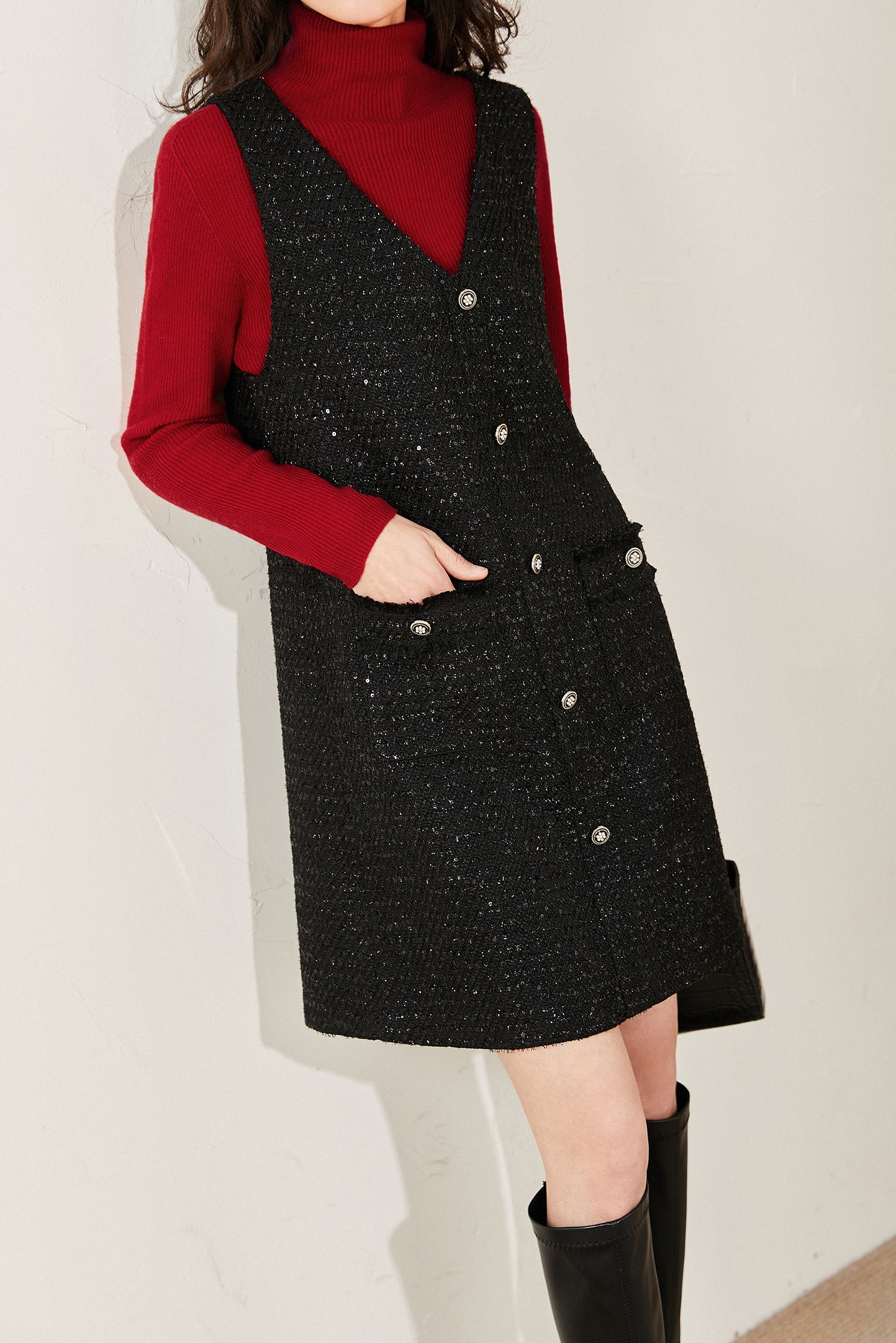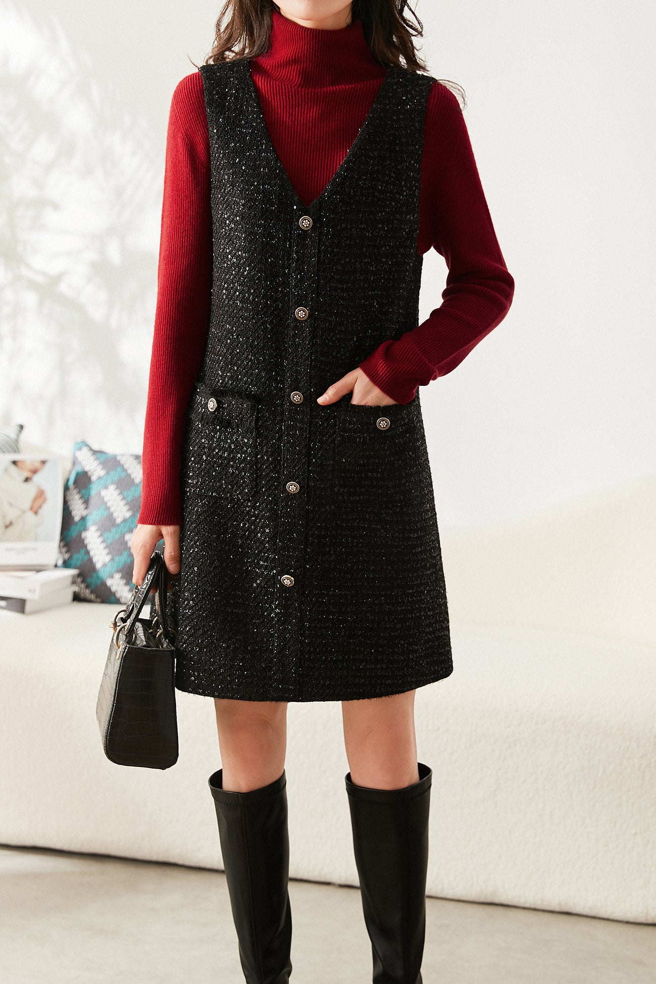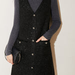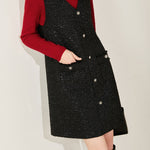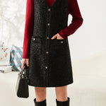 Dress in solid color with a V-neck, sleeveless A-line silhouette, faux placket with decorative buttons at the front, two patch pockets at the waist, and hidden zipper at the back |