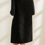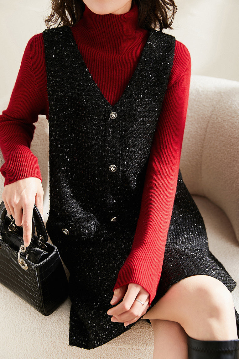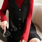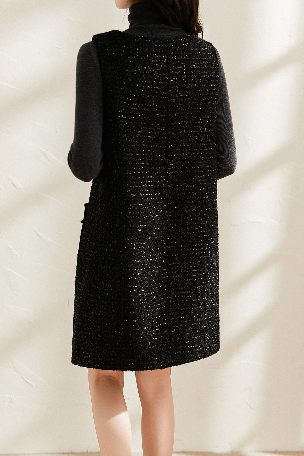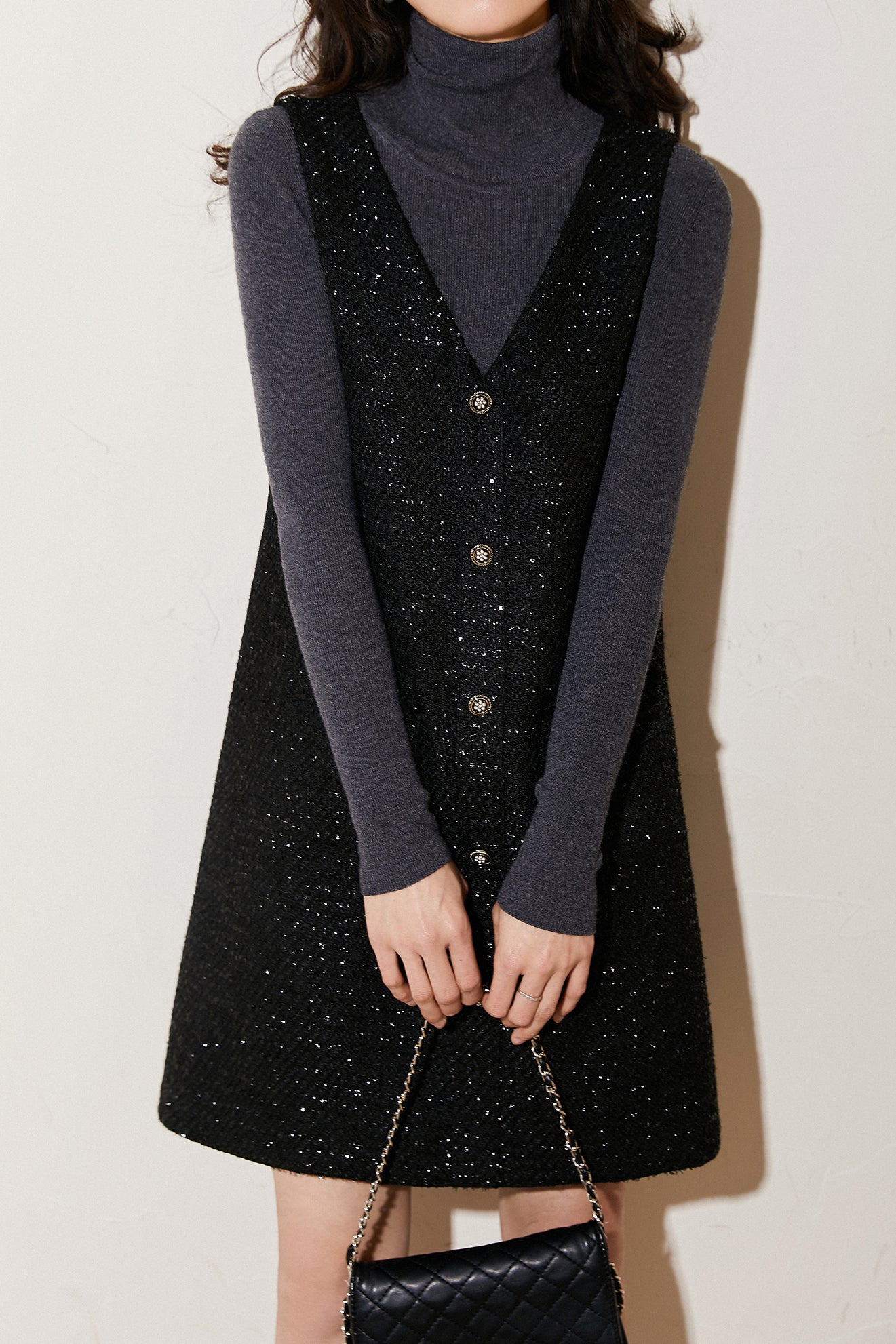 Dress in solid color with a V-neck, sleeveless A-line silhouette, faux placket with decorative buttons at the front, two patch pockets at the waist, and hidden zipper at the back |