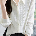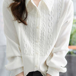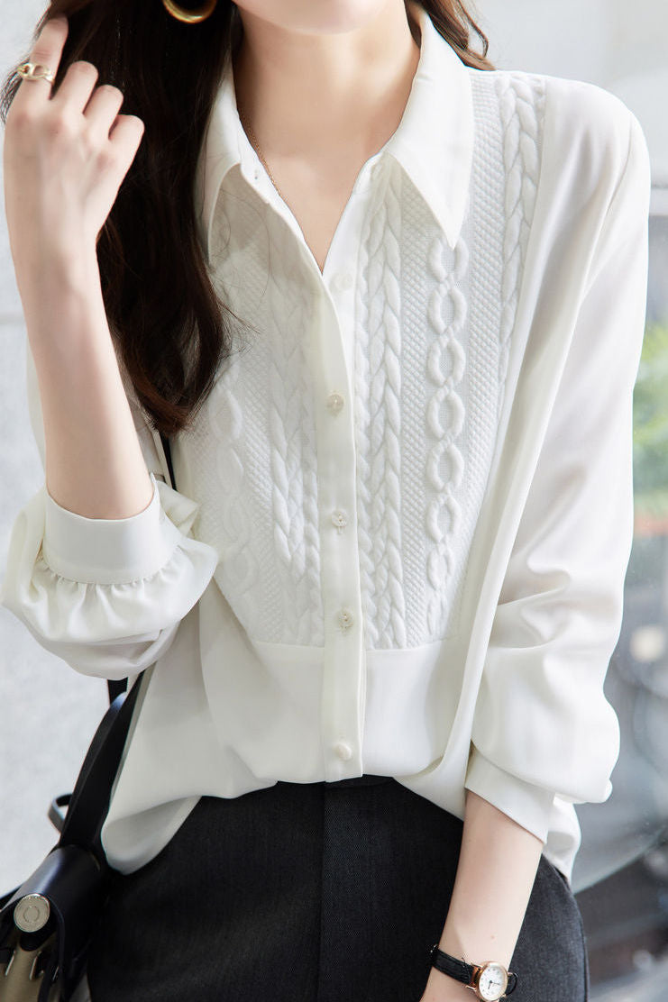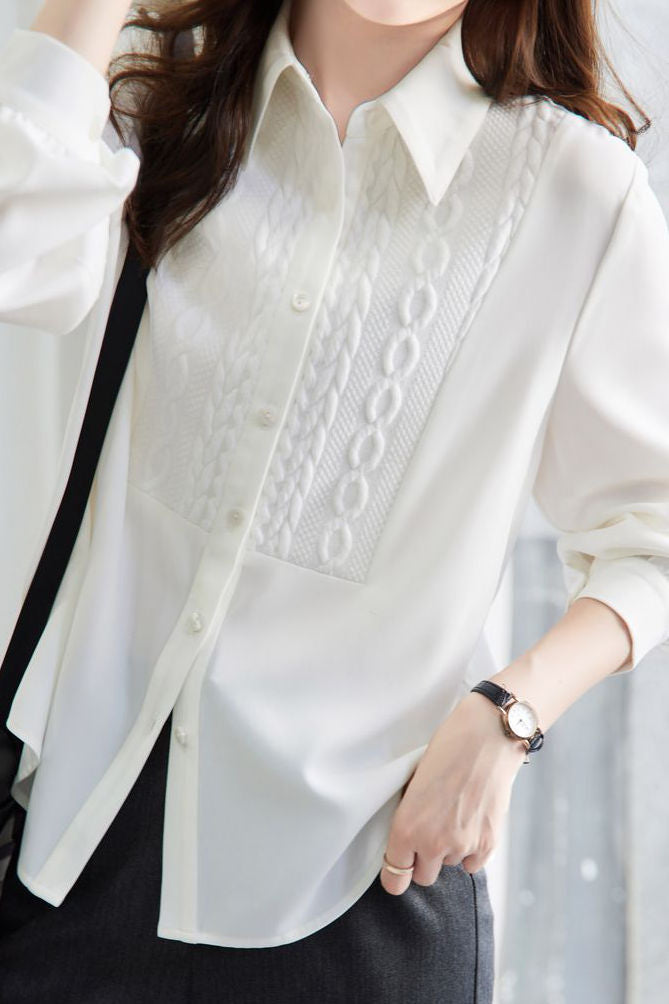 Shirt,lapel front button-front unbuttonable,front panel panelled with knitted textured fabric knitted textured fabric cut randomly,long sleeve cuffs with slits button closure unbuttonable,solid color |