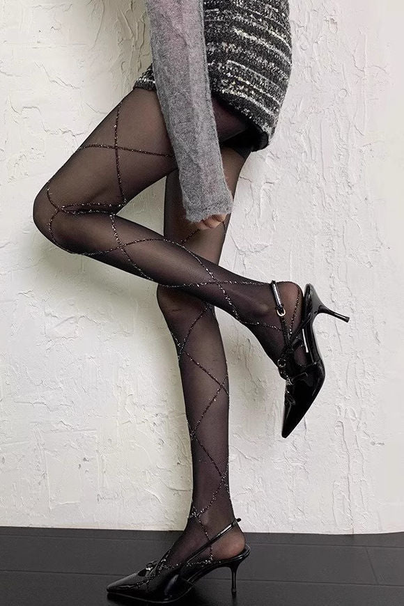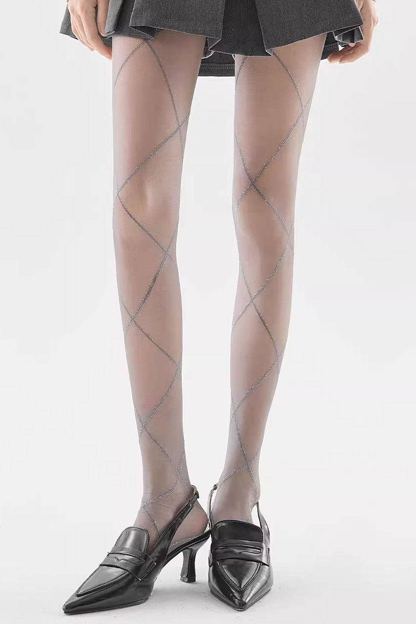 Retro Elegant Silver Thread Diamond-Check Pantyhose