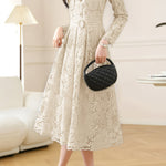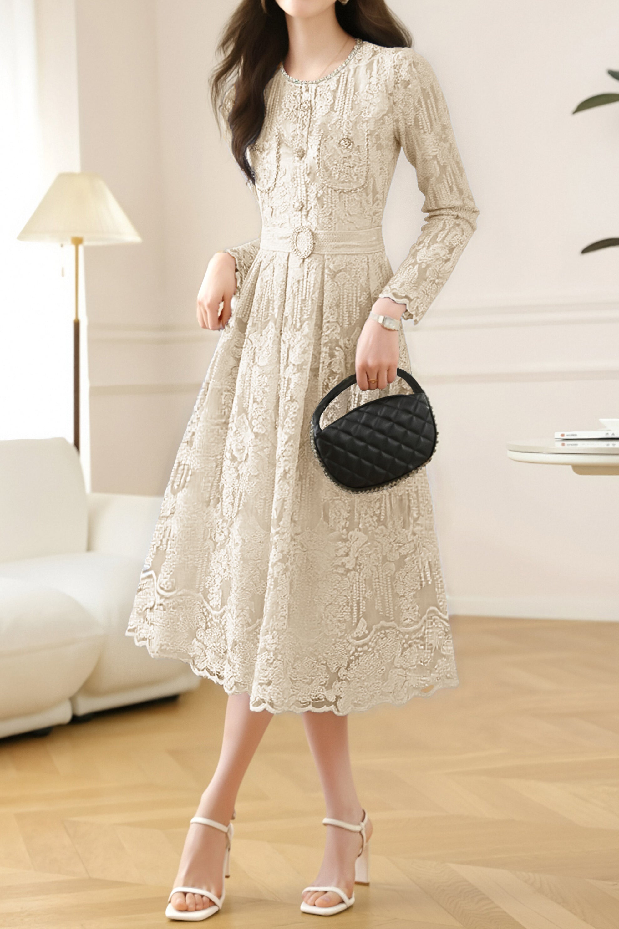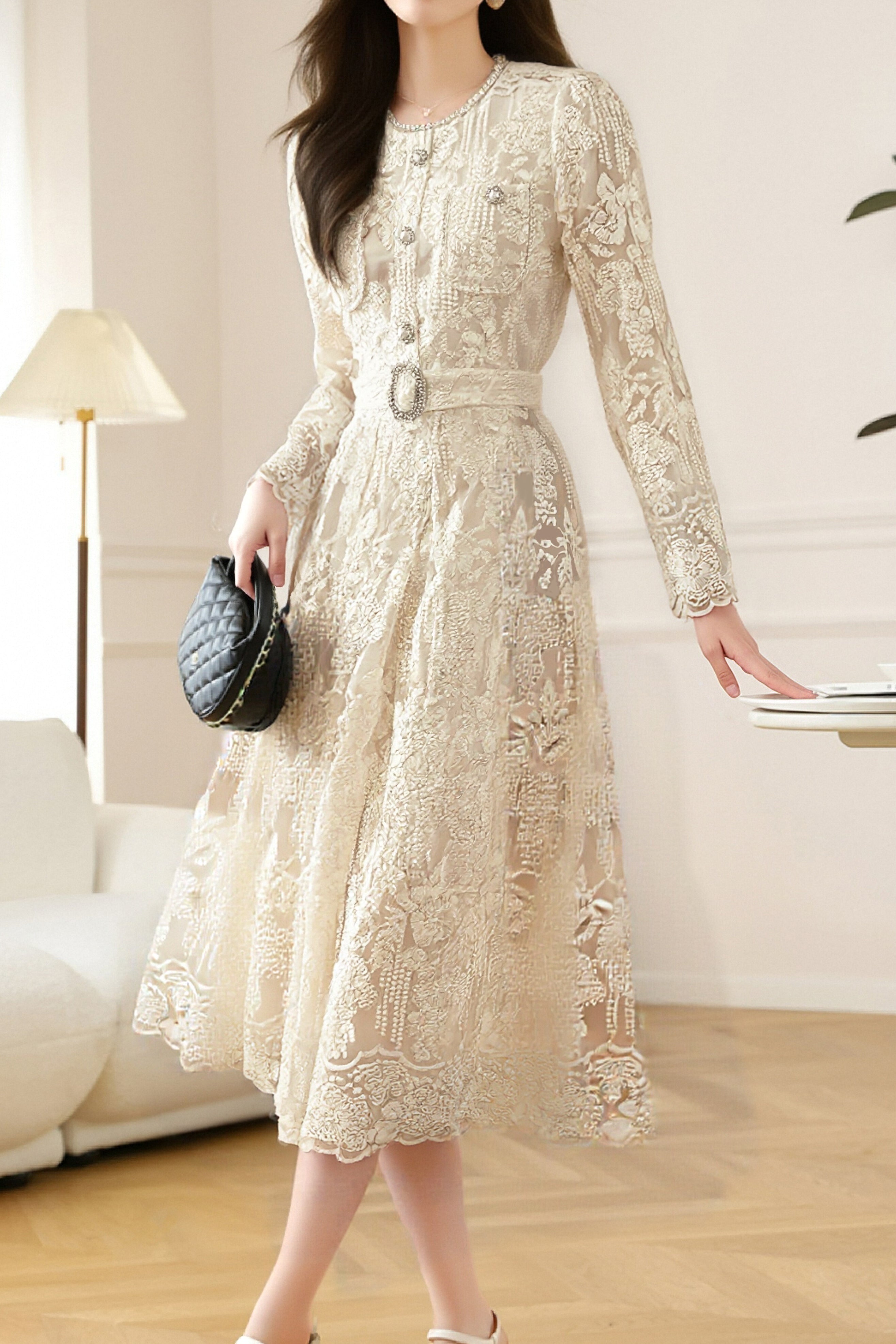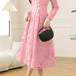 Elegant Exquisite Fitted-Waist Long-Sleeve Lace Dress