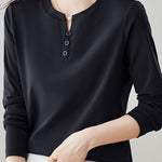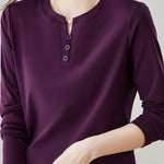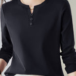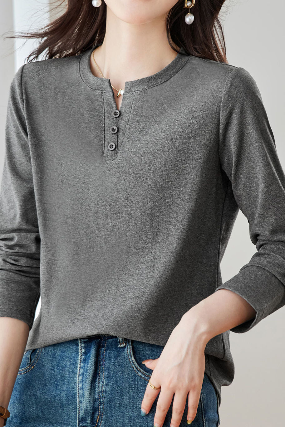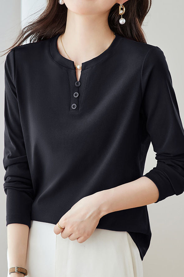 Long-sleeve t-shirt, crew neck, decorative button on front neck, long sleeves, solid color |