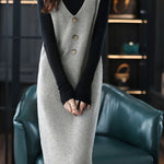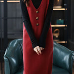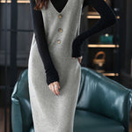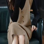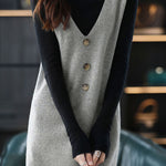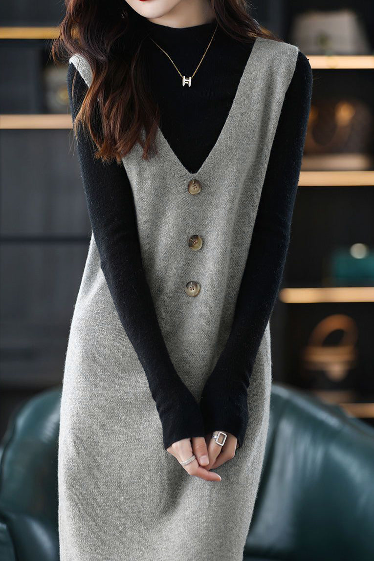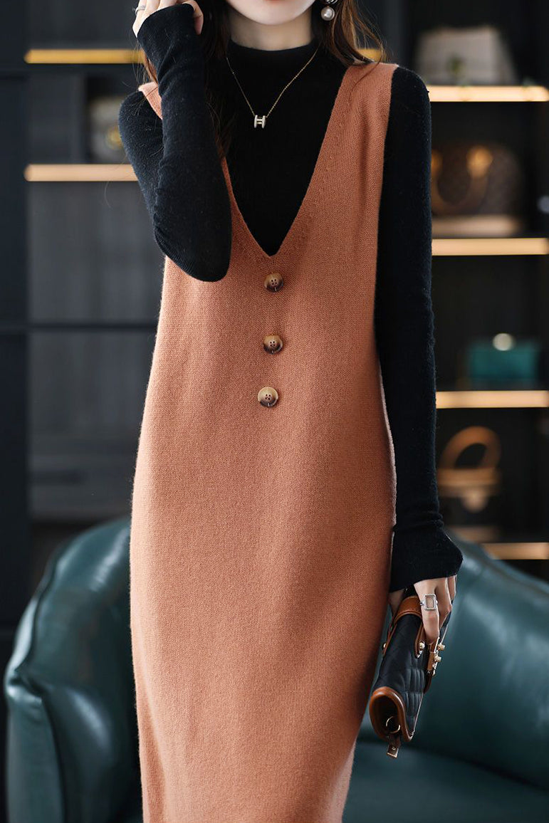 Knitted dress, v-neck, decorative button on front center, knitted elastic fabric, sleeveless loose fit |