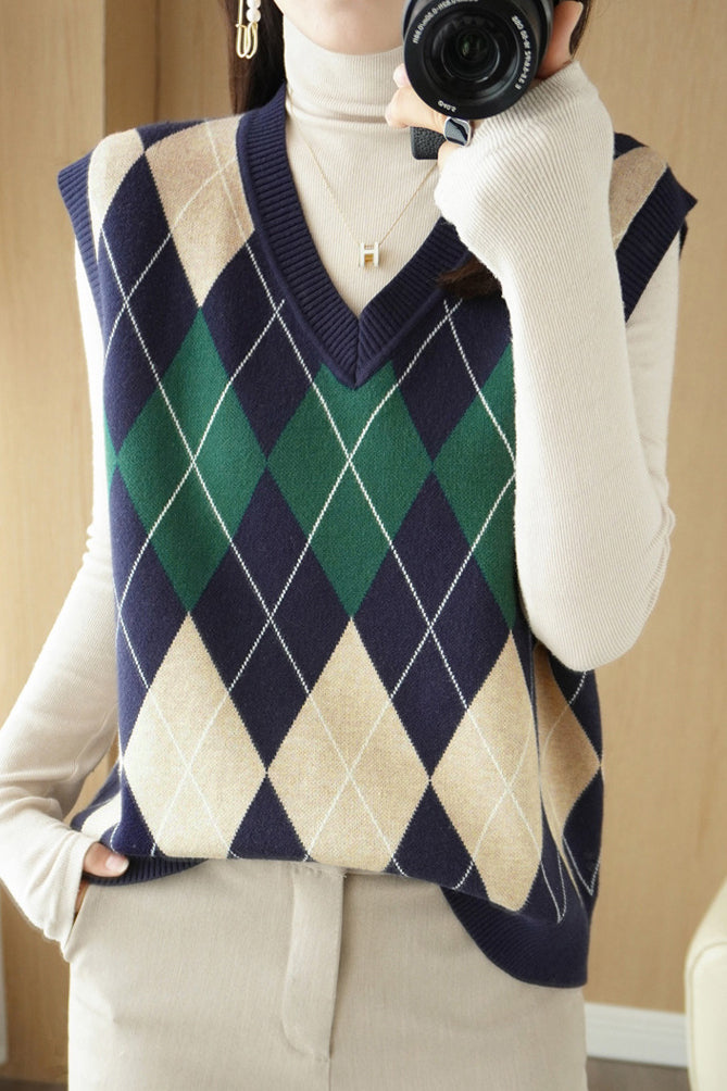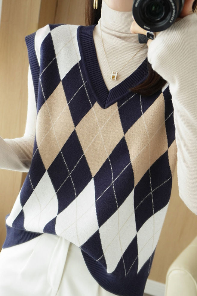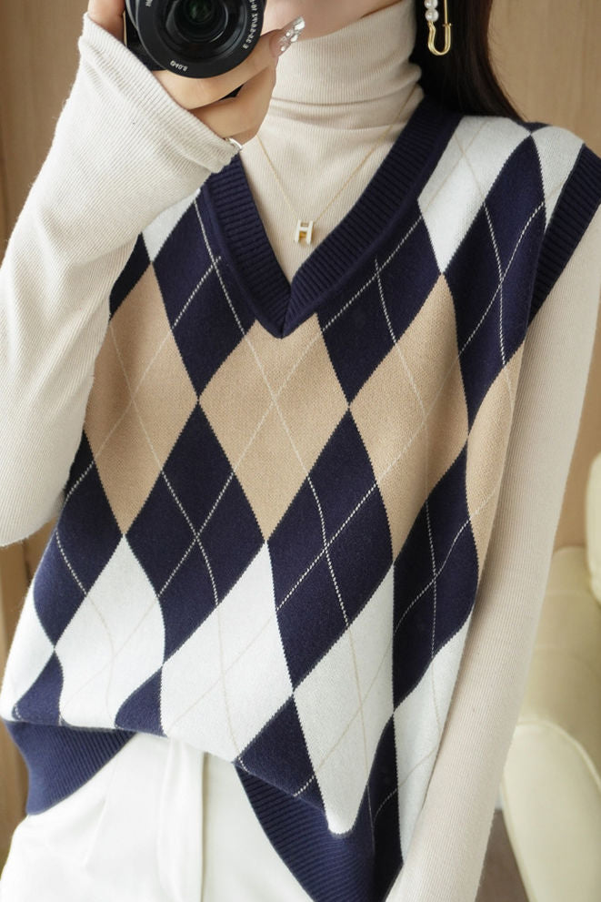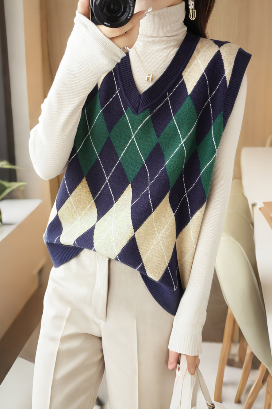 Knitted vest,v-neck loose fit,argyle color-block pattern,ribbed texture on neckline,cuffs and hem |
