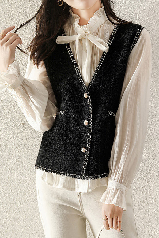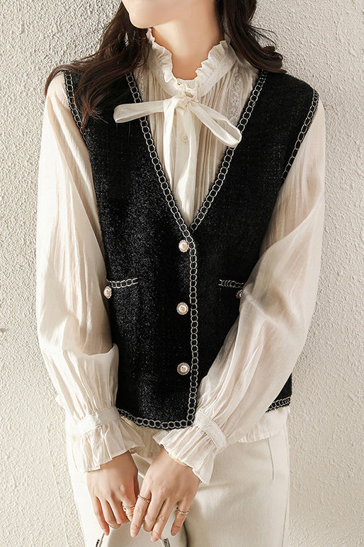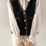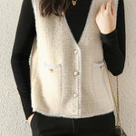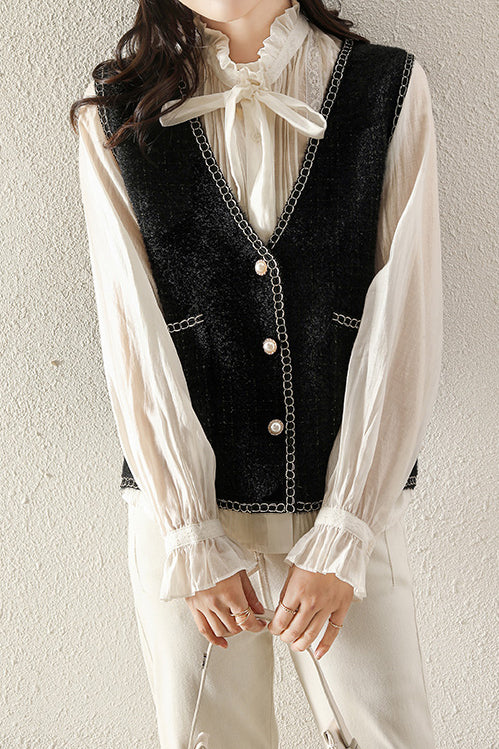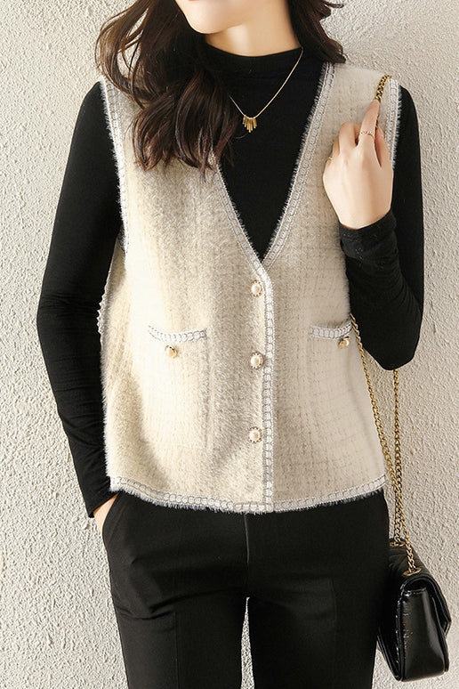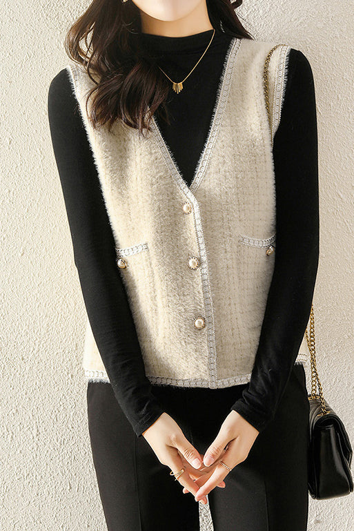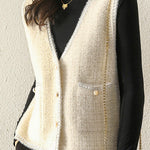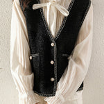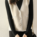 Knitted vest,sleeveless cardigan loose fit,full-body square lurex pattern,with gold ring edging and pearl buttons |