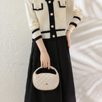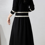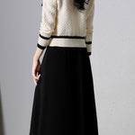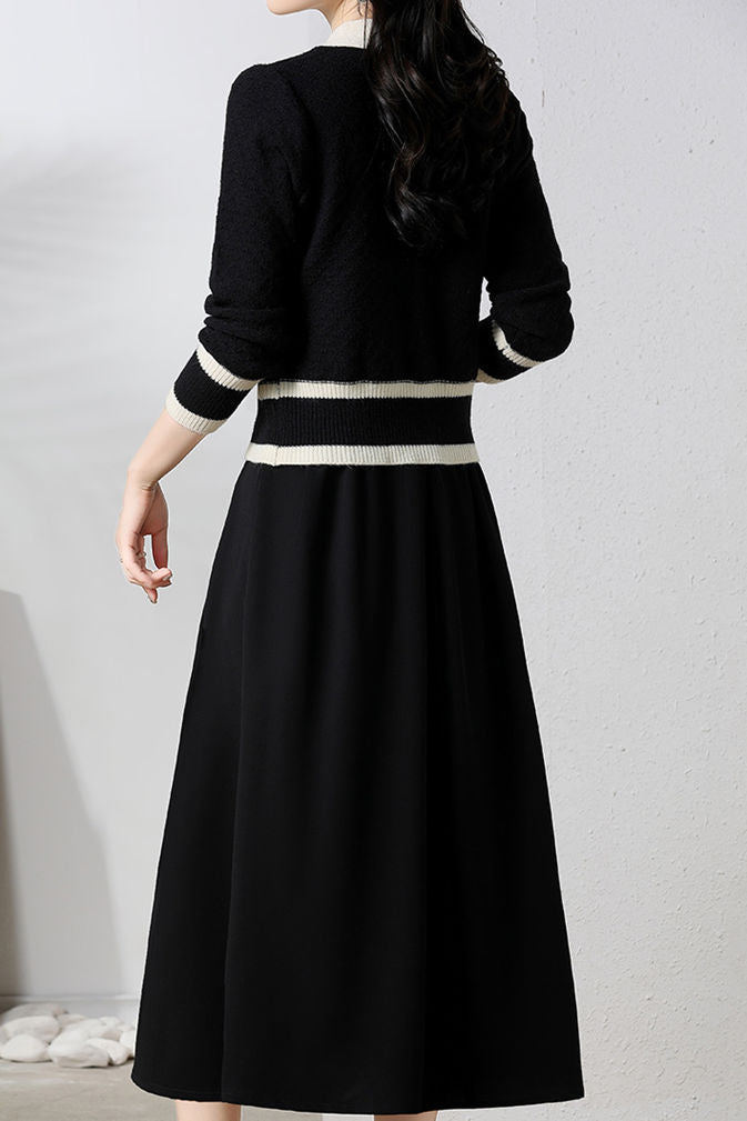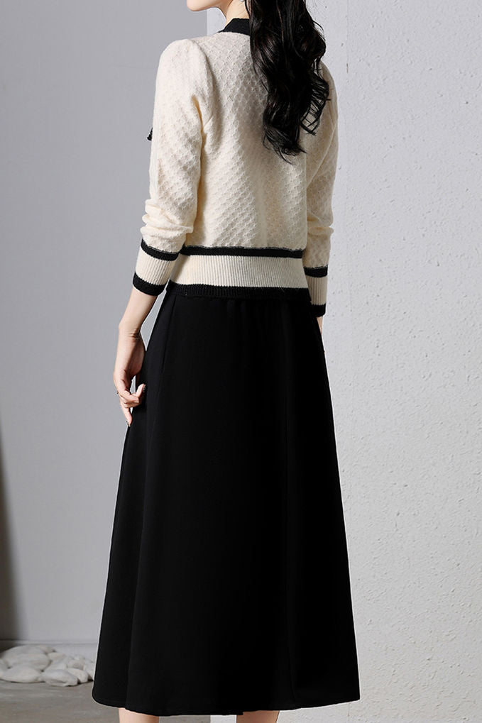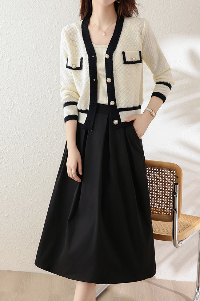 Cardigan a-line skirt 2-piece set,top hem and cuffs with striped color-block design,decorative patch pockets on front chest,skirt with side pockets and elastic band design |