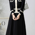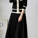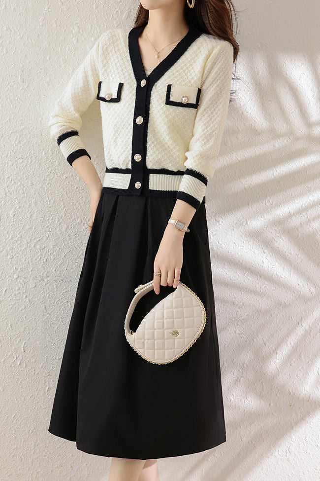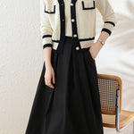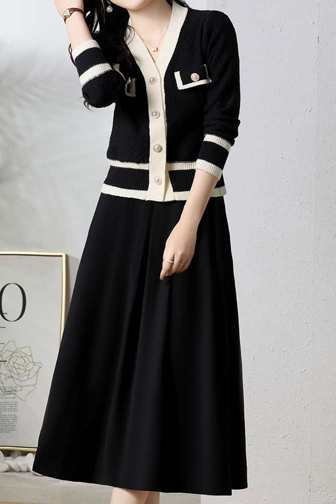Elegant V-Neck Color-Block Cardigan A-Line Skirt 2-Piece Set