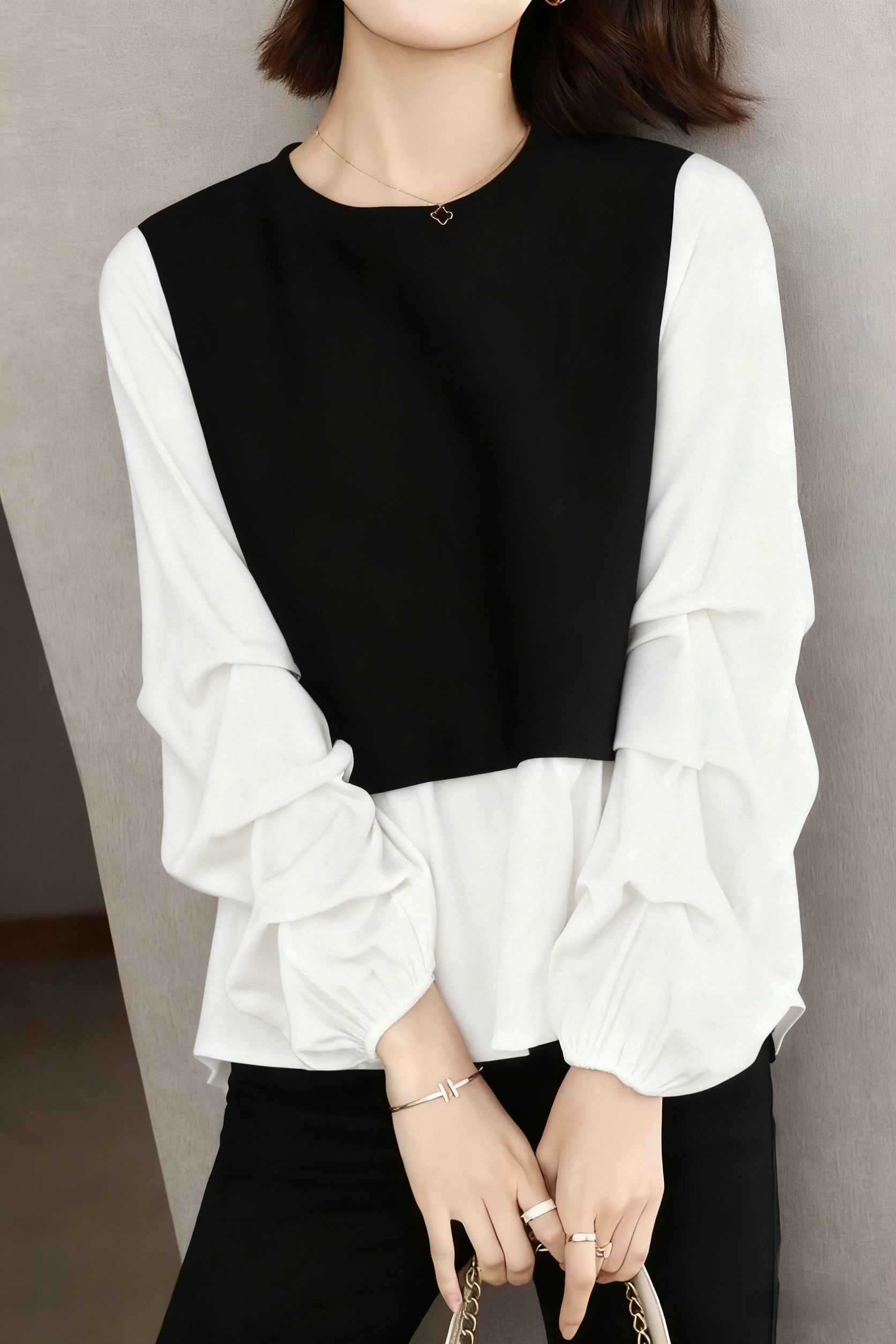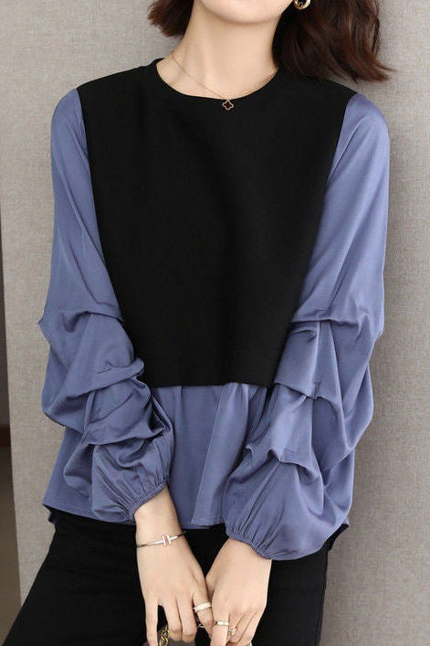 Shirt,body and sleeves form a fake two-piece design with skirt,sleeves with gathered shape |