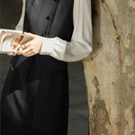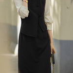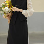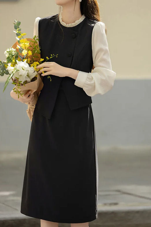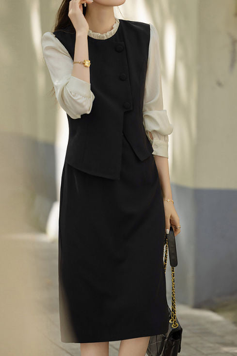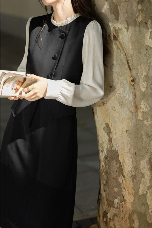 Dress,crew neck long-sleeve loose pullover fit,front center with decorative asymmetric openable placket,ruffled neckline,sleeves and lining splicing form fake two-piece design,back center with openable zipper |