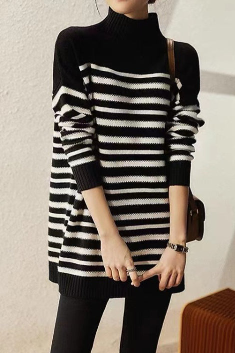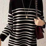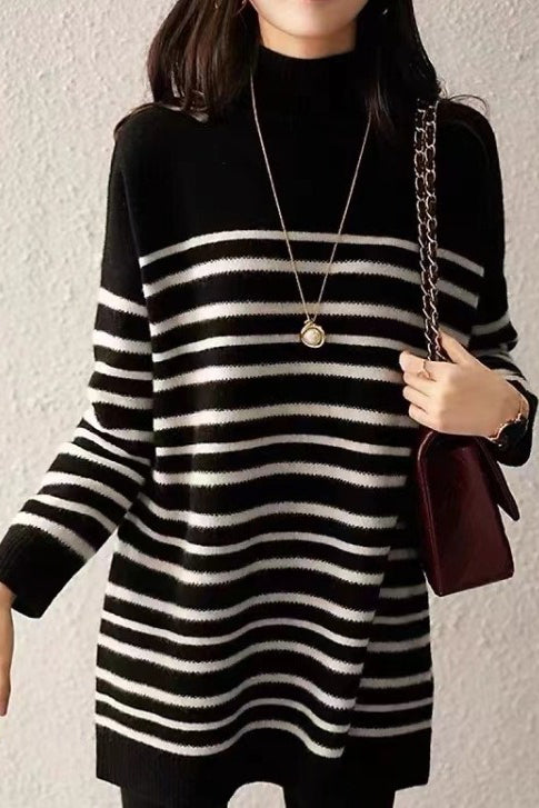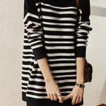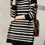 Knitted dress,crew neck long-sleeve loose fit,color-block striped design,neckline,cuffs and hem with ribbed texture |
