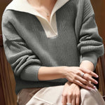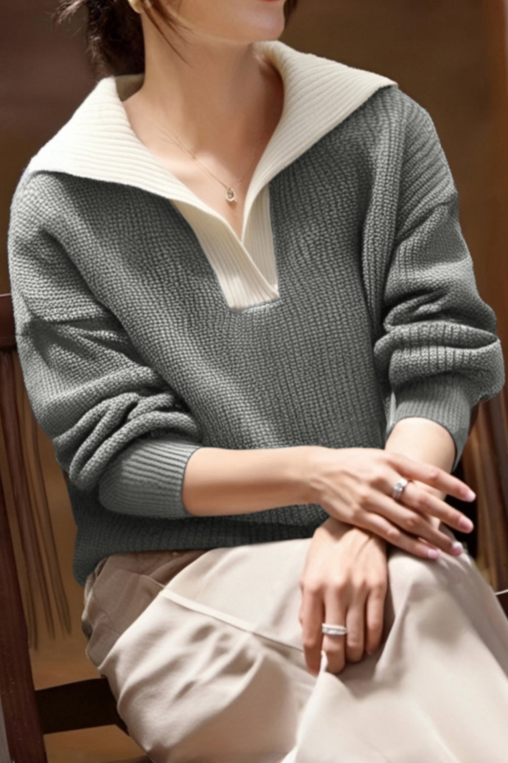 Pullover sweater,lapel long-sleeve loose fit,off-white lapel and gray body form color-block fake two-piece style |