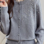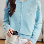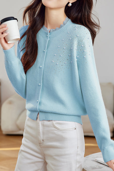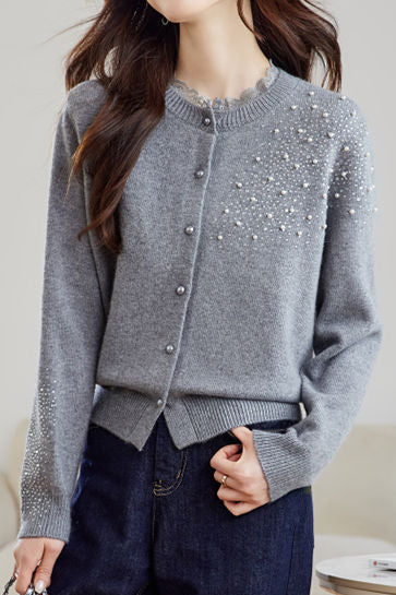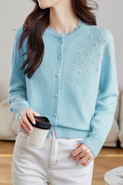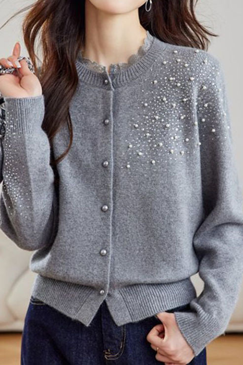 Casual Versatile Lace-Trimmed Crew Neck Beaded Cardigan