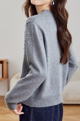 Cardigan,crew neck long-sleeve loose fit,left shoulder to chest with beading and sequin design,crew neck with lace trim design around |