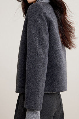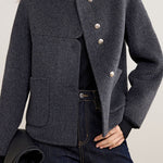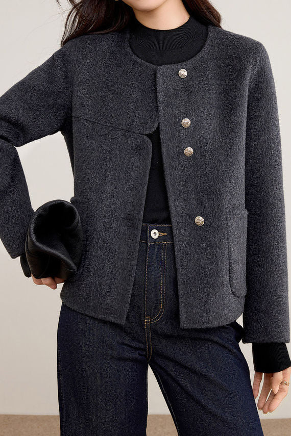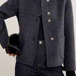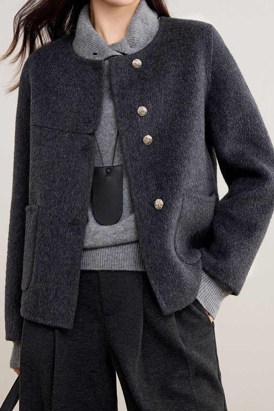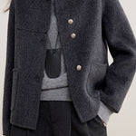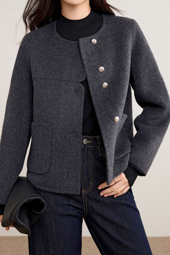 Coat,crew neck loose fit,front center with openable buttons,right chest with decorative split line design,two patch pockets on both sides |