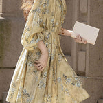 Dress,crew neck long-sleeve loose pullover fit,neckline with drawstring,collar to chest with openable buttons,full-body with printed floral pattern design,sleeves with lantern sleeve fit |