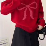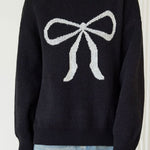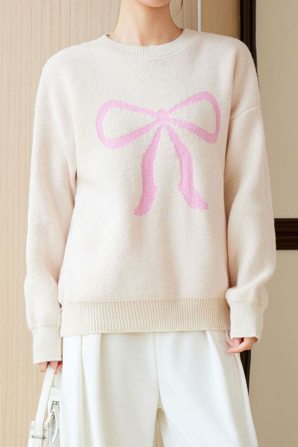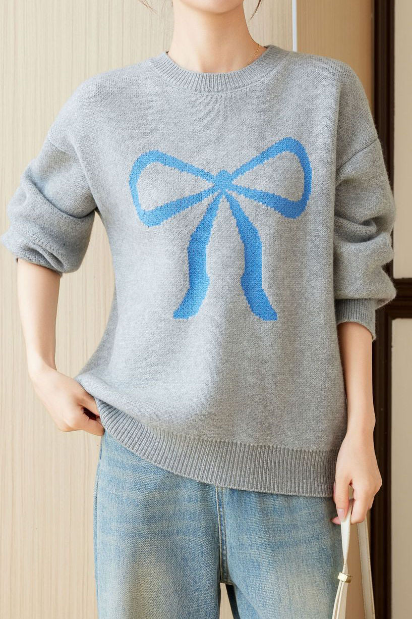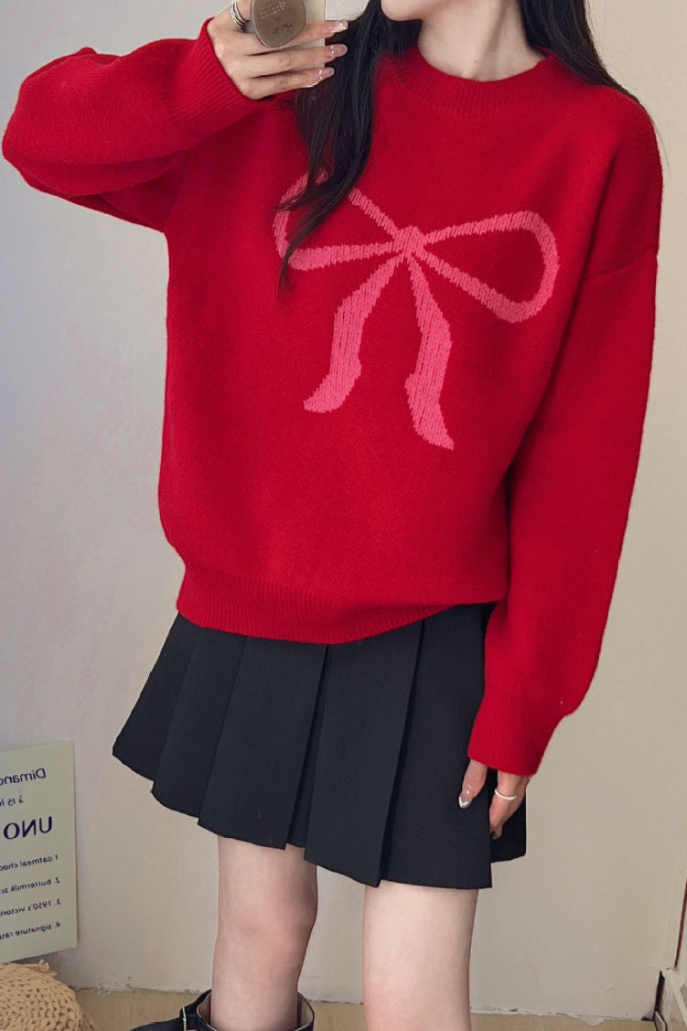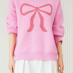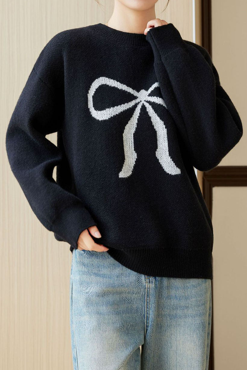 Pullover sweater,crew neck long-sleeve loose fit,front center with large color-block bow-knot pattern design |