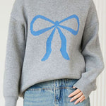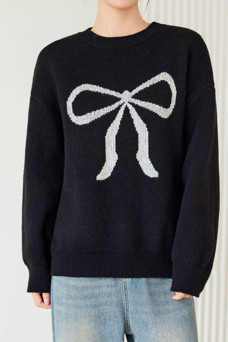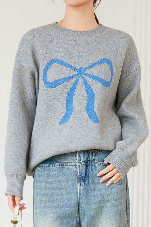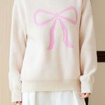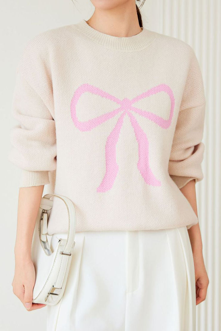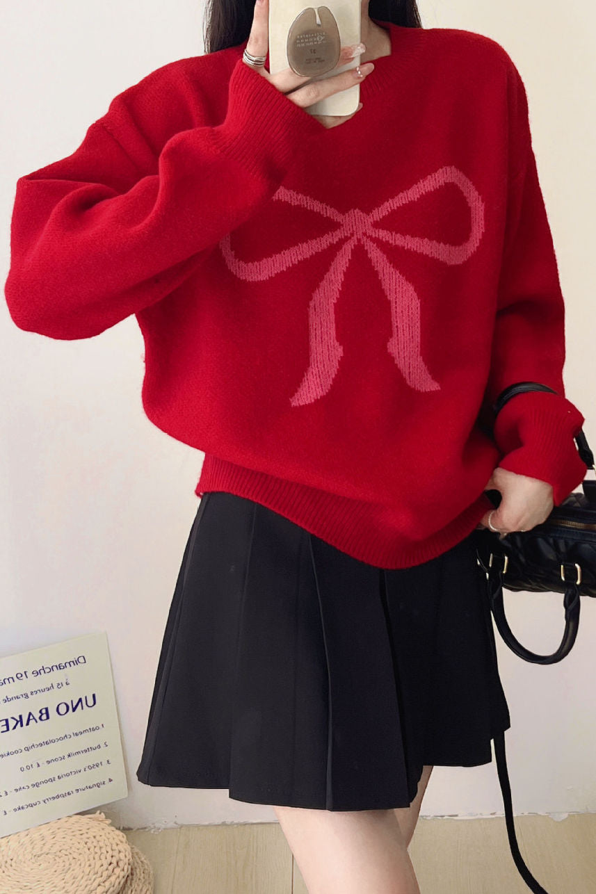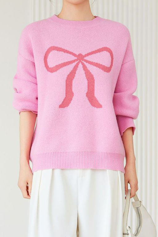 Pullover sweater,crew neck long-sleeve loose fit,front center with large color-block bow-knot pattern design |