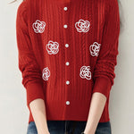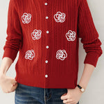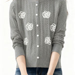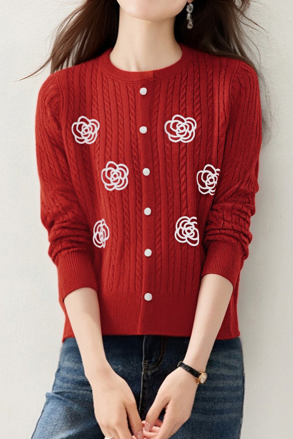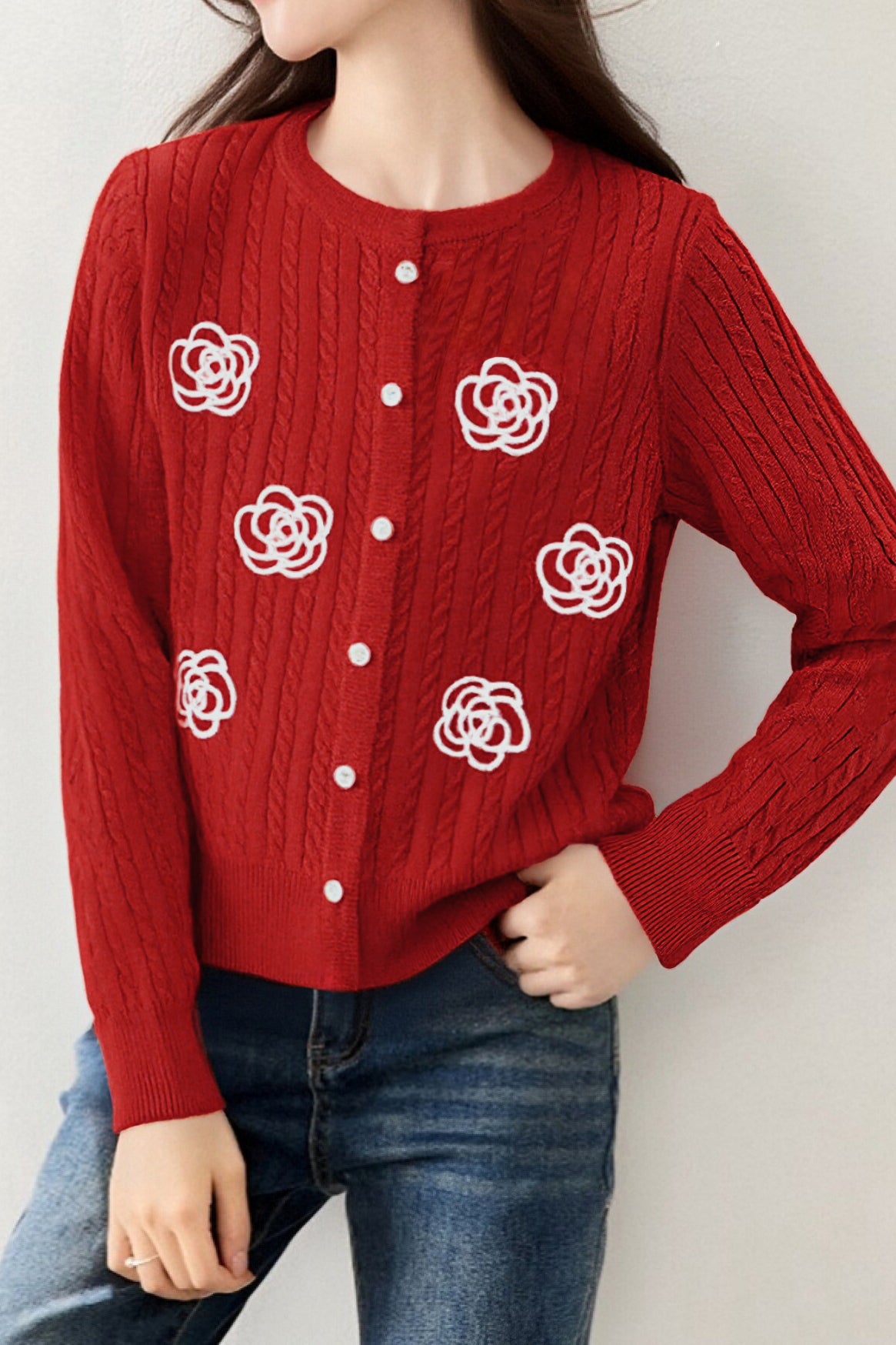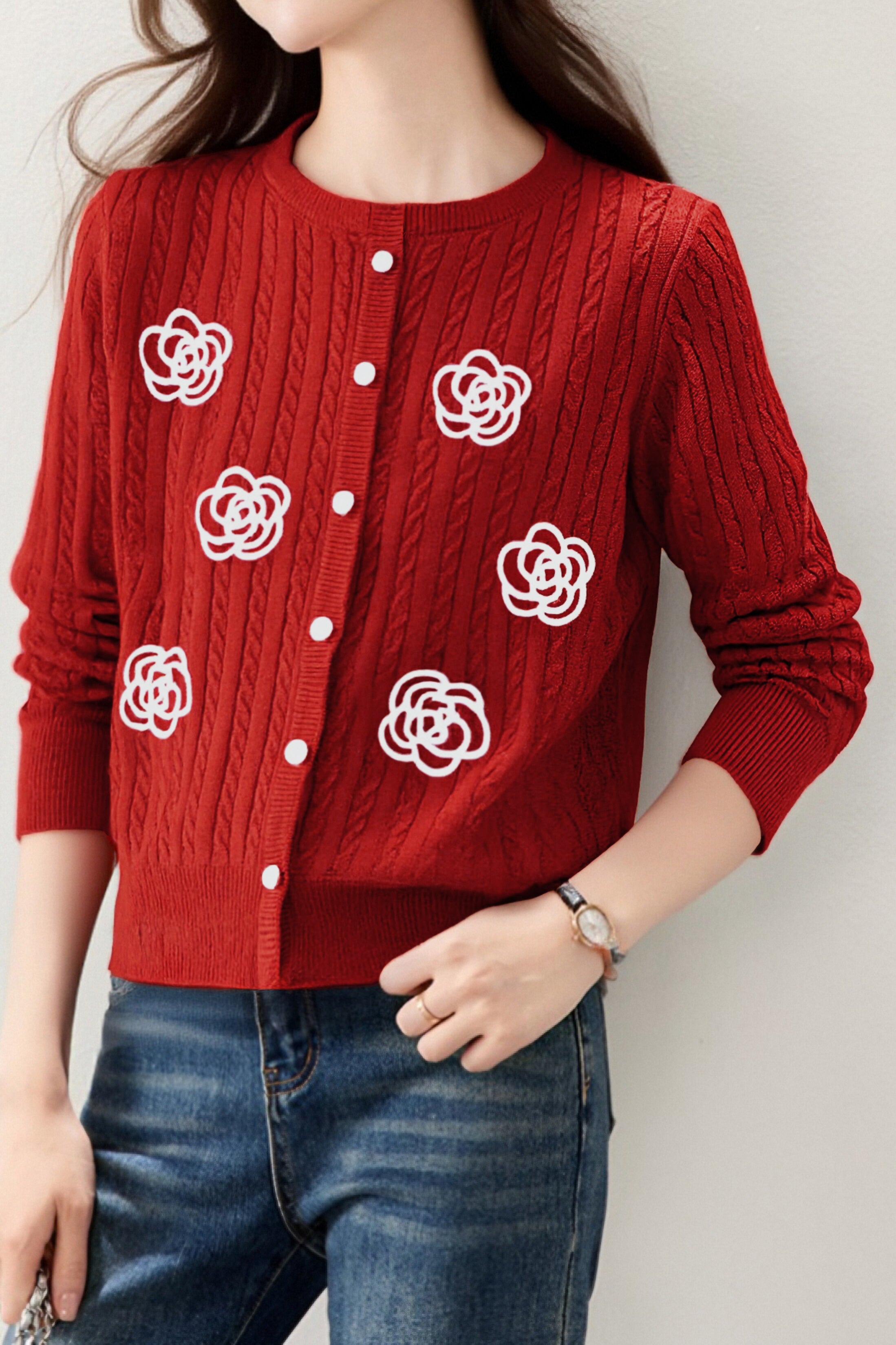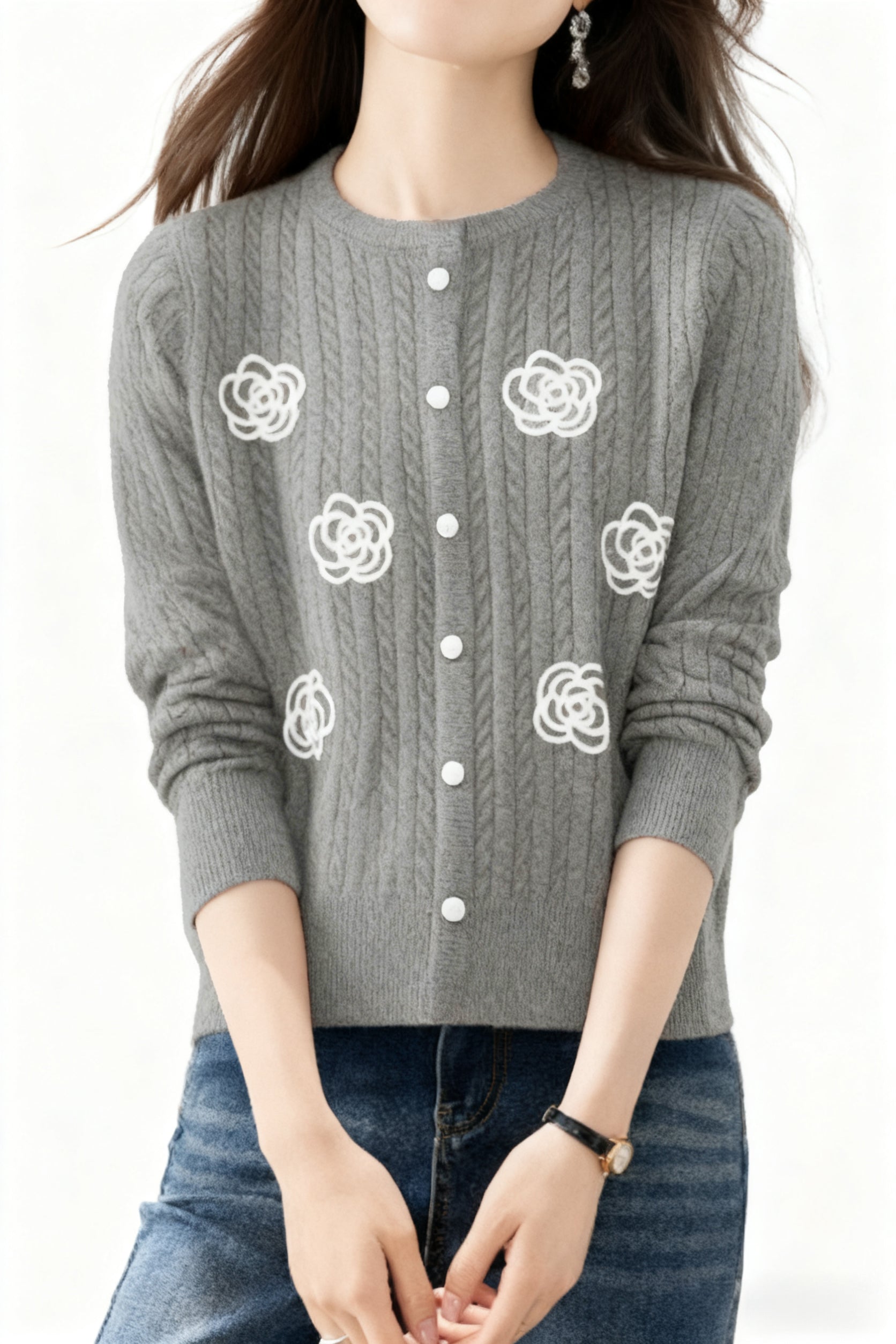 Cardigan,crew neck long-sleeve loose fit,front center with openable buttons,full-body with vertical rib texture,front panel with flower jacquard design |