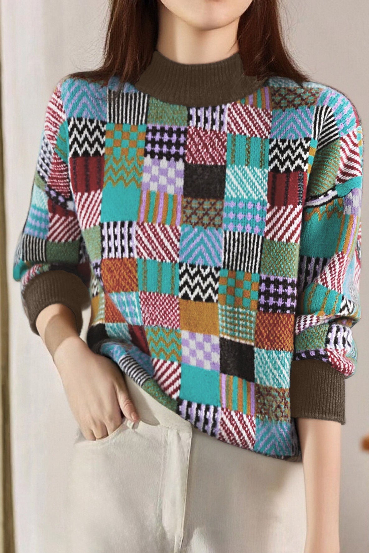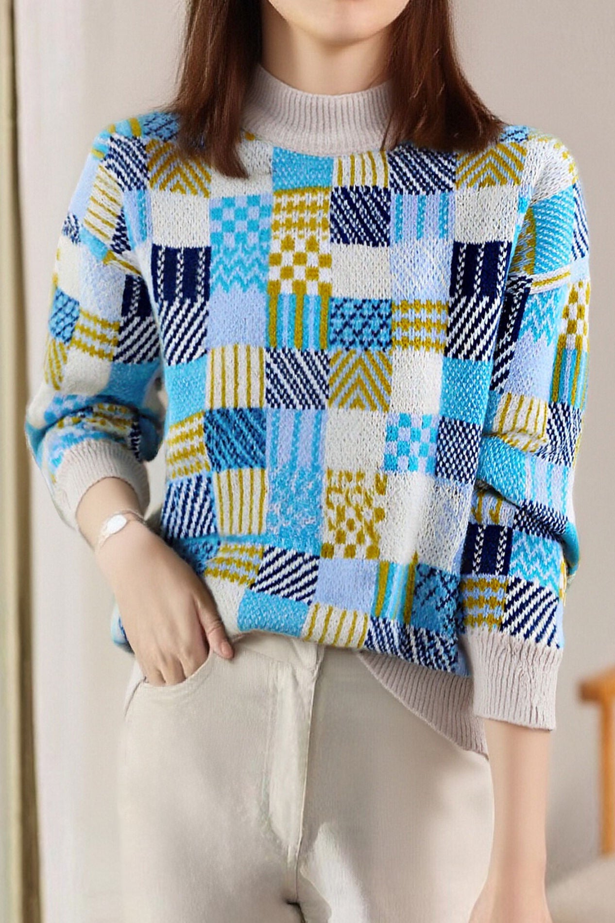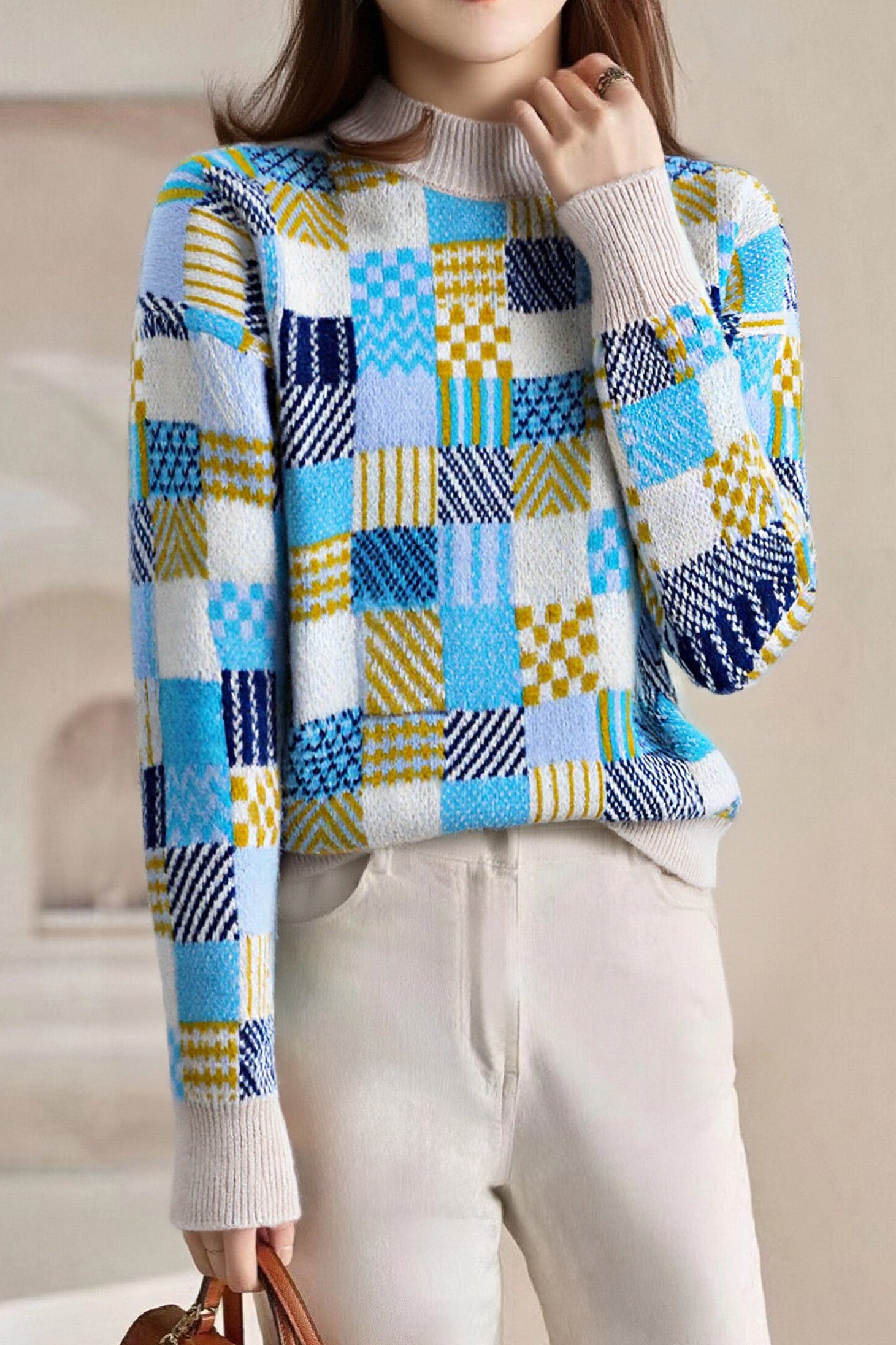Casual Versatile Plaid Color-Block Half-High Neck Sweater