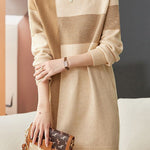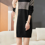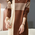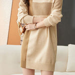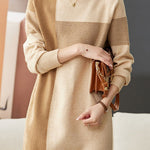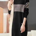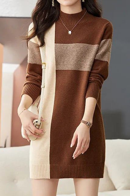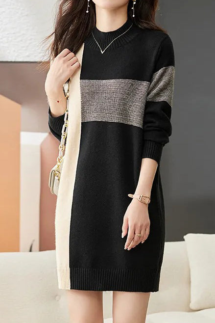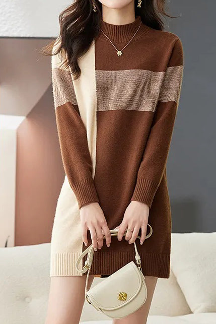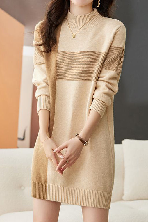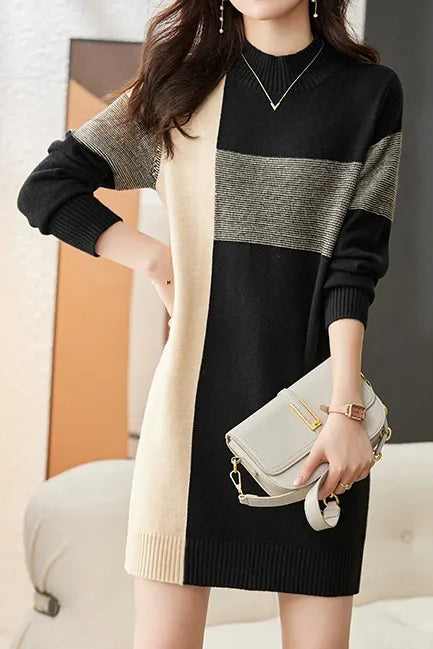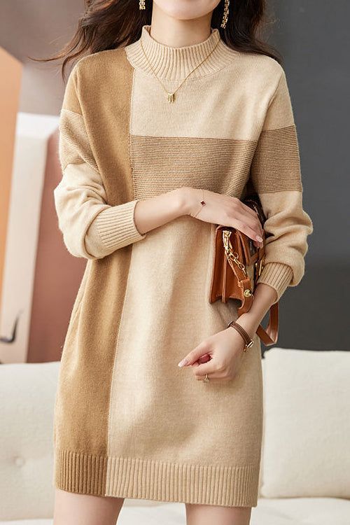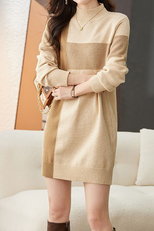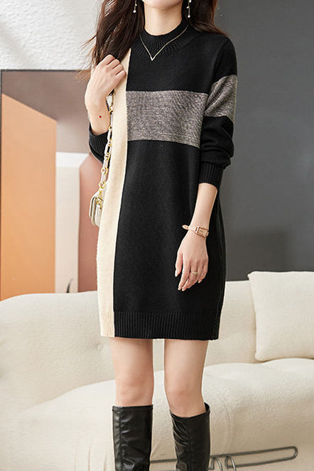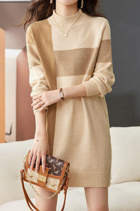 Dress,half-high neck long-sleeve loose straight short fit,full-body with vertical fine rib texture,right side of body, chest and sleeves with striped color-block design |