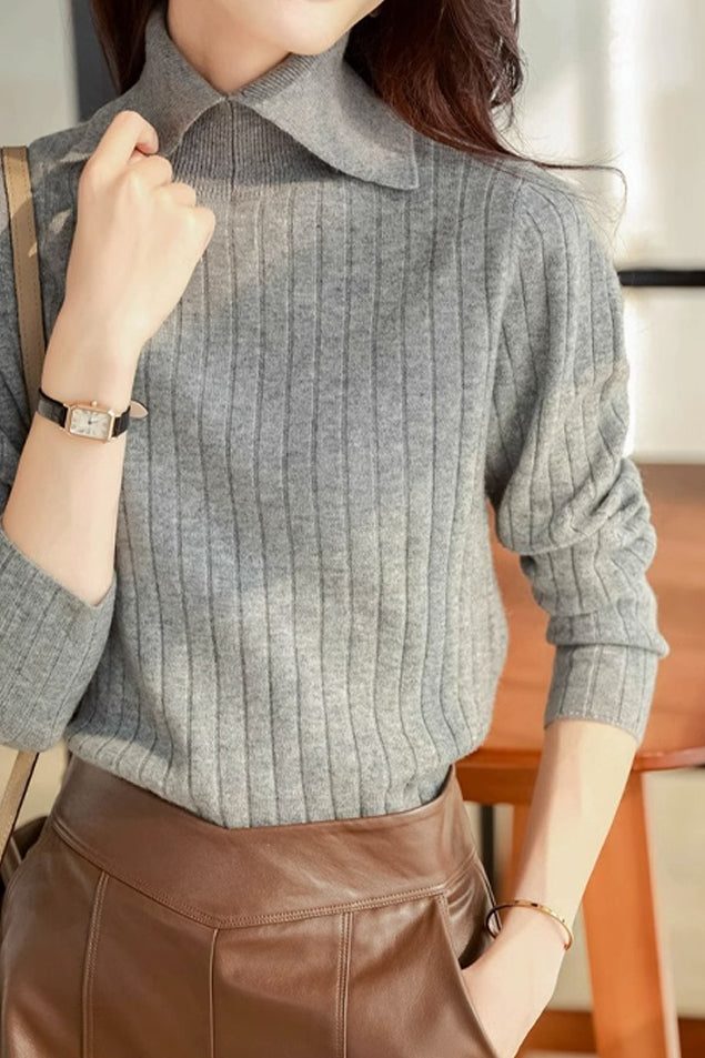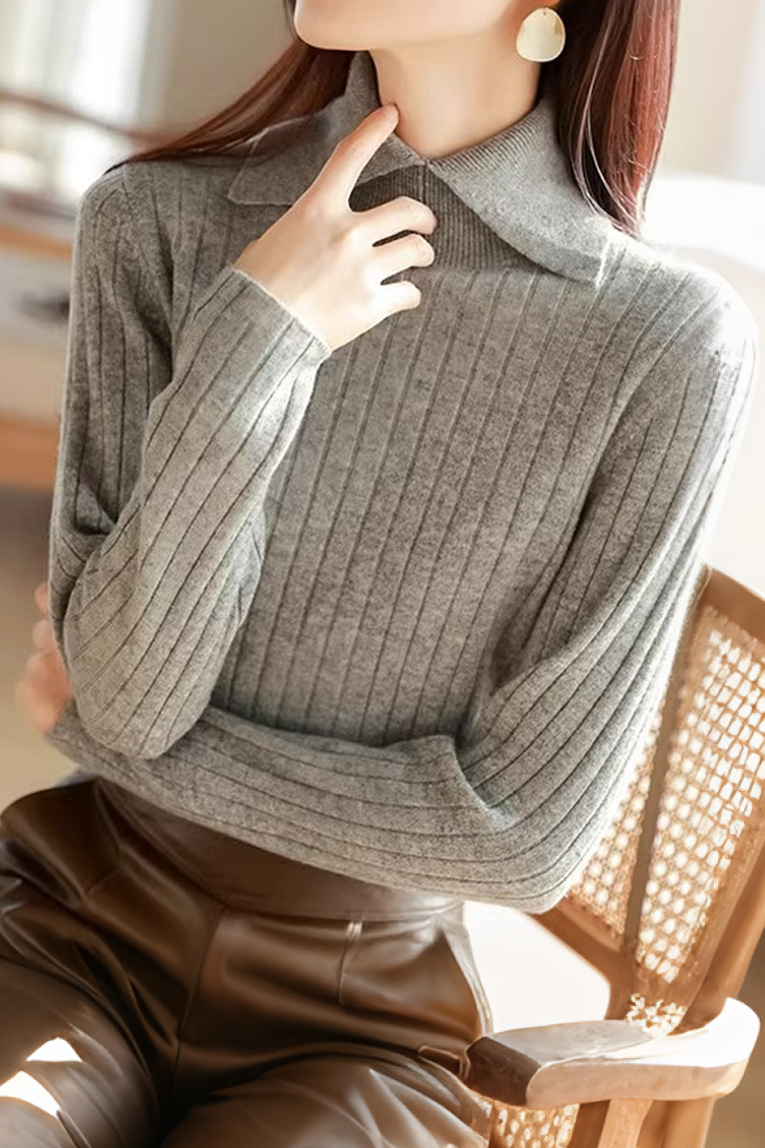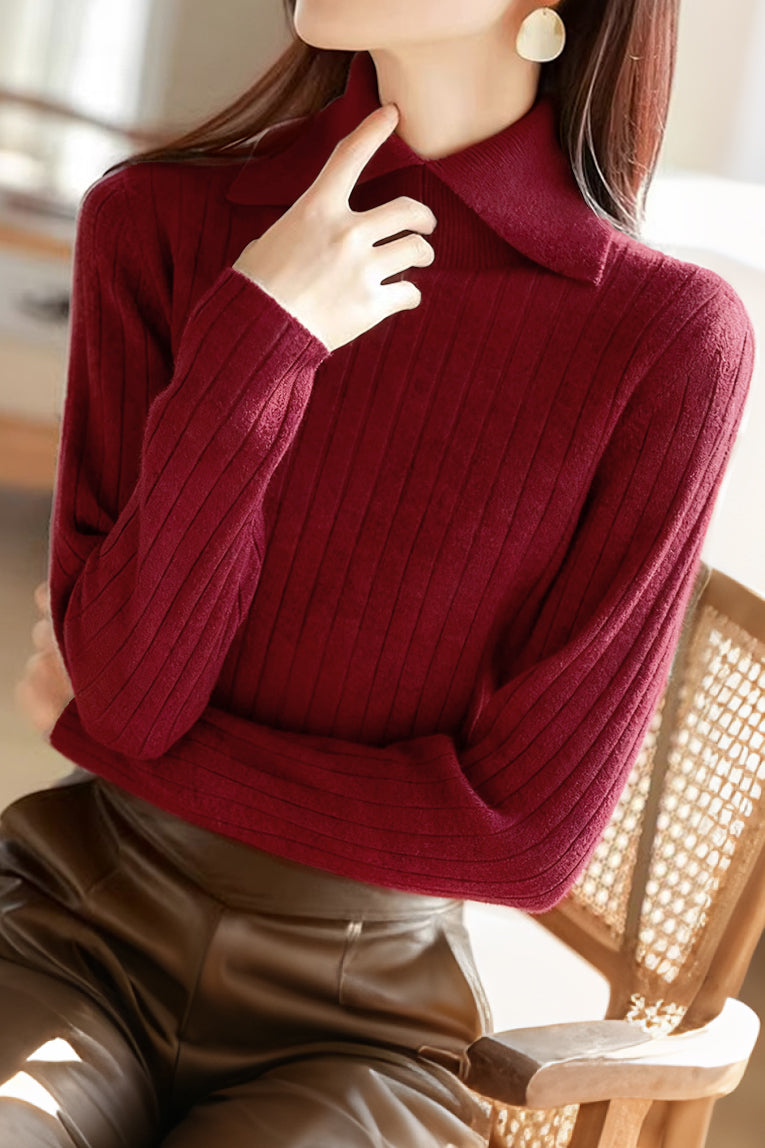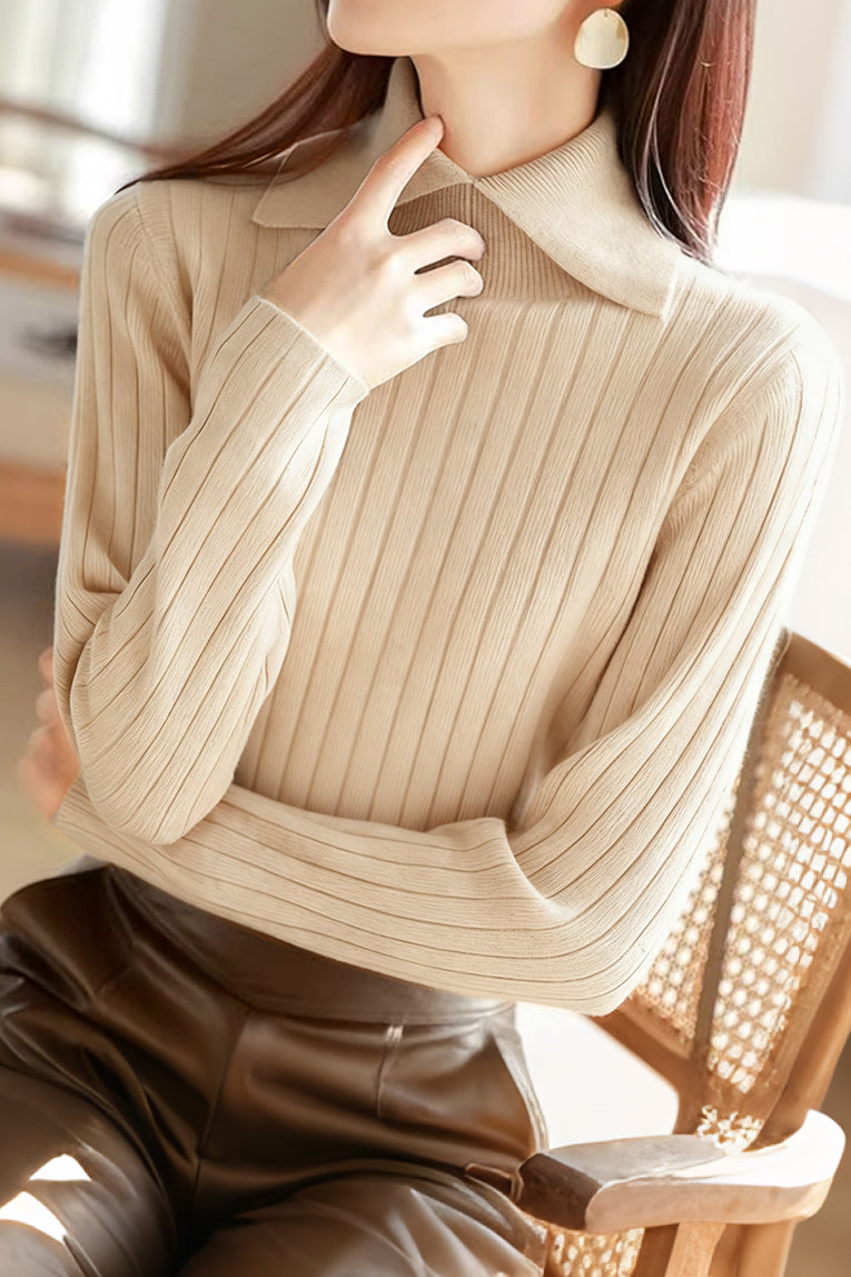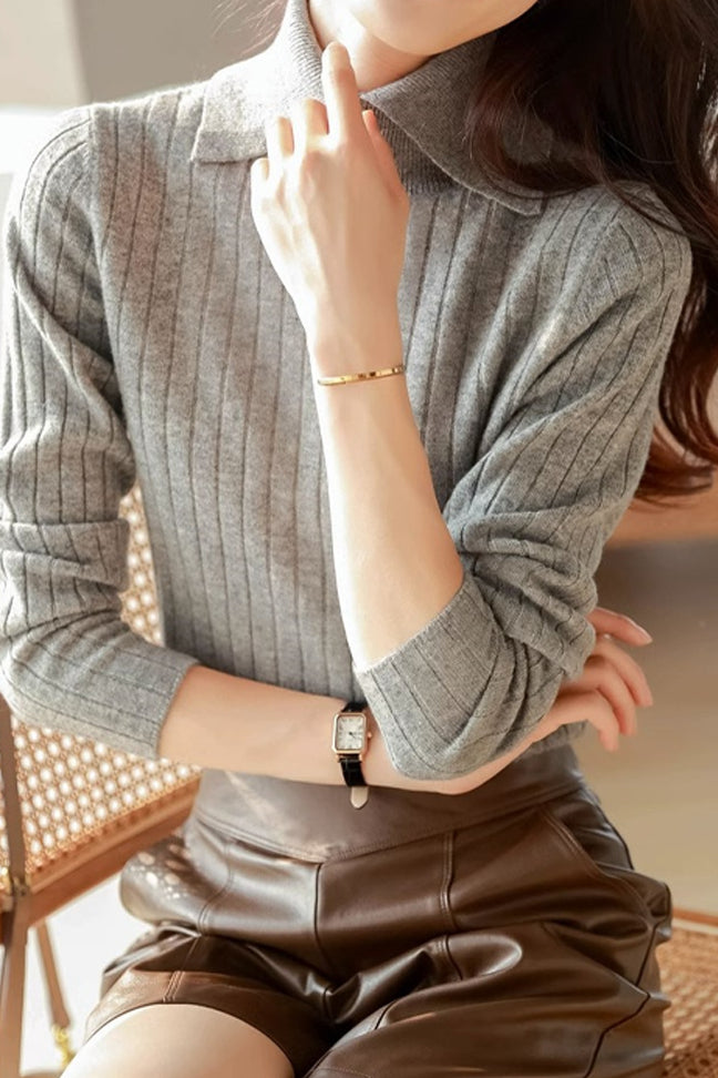 Knitted top,lapel long-sleeve loose fit,full-body with solid color and vertical chunky rib design |
