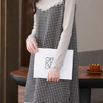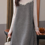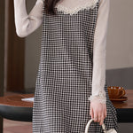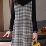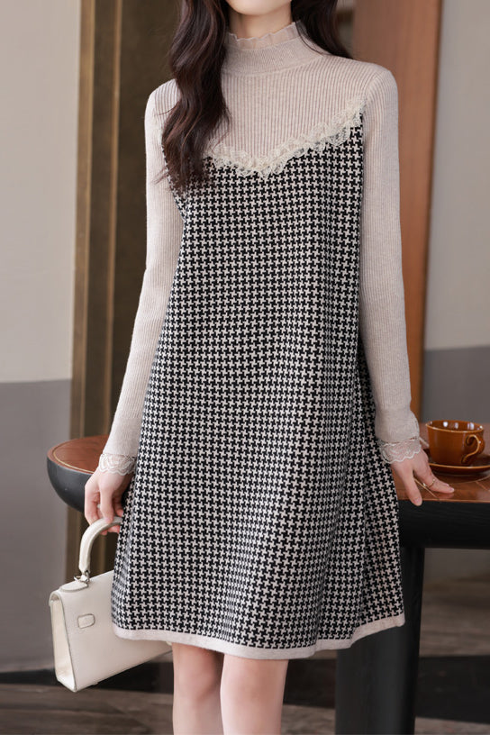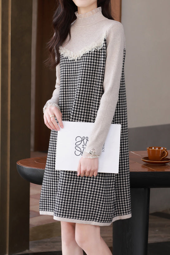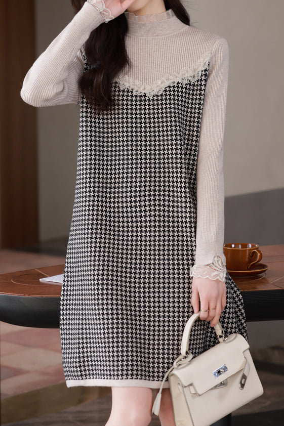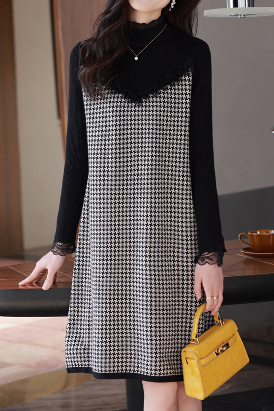 Fake two-piece knitted dress,half-high neck sheer paneled with houndstooth skirt body,delicate and appropriate lace edging,A-line version to modify the figure,drapey and comfortable fabric |