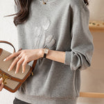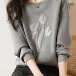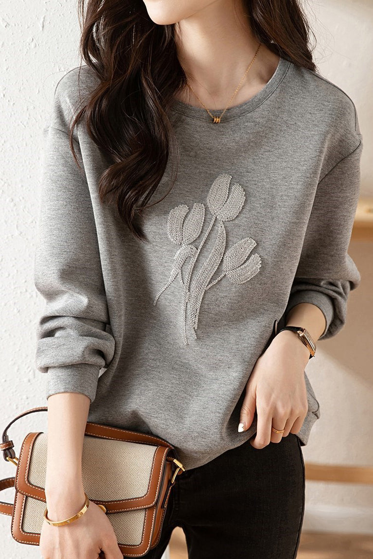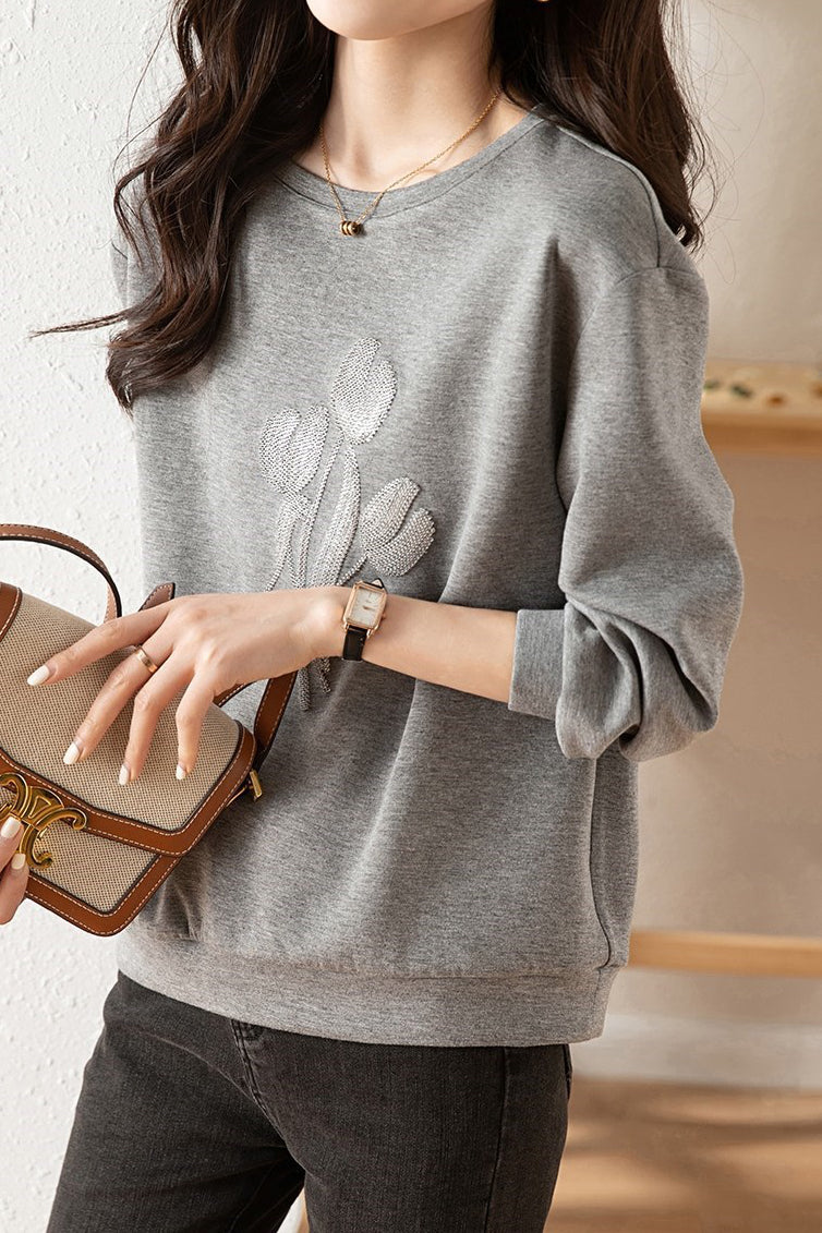 Gray sweatshirt,featuring a crew neck design,decorated with tulip hot-drilled patterns on the body for exquisite and eye-catching details,soft and skin-friendly fabric,loose and comfortable version,cuffed cuffs for neatness,combining beauty and adaptability for daily wear |