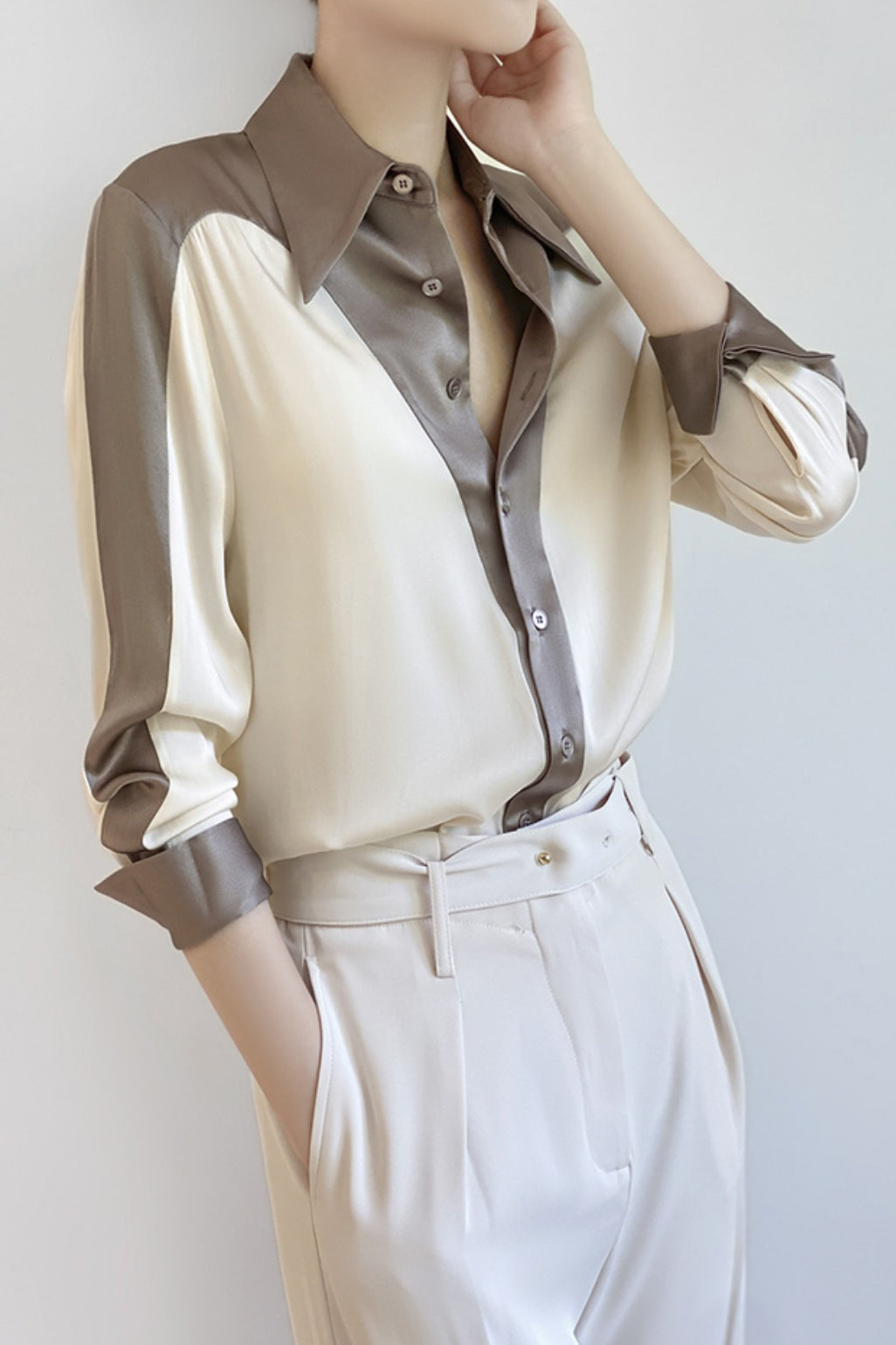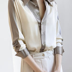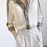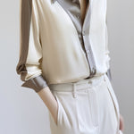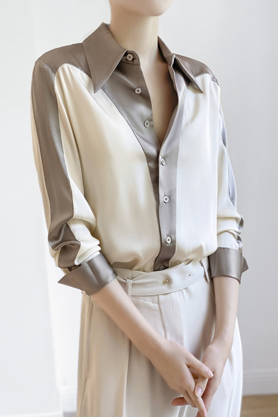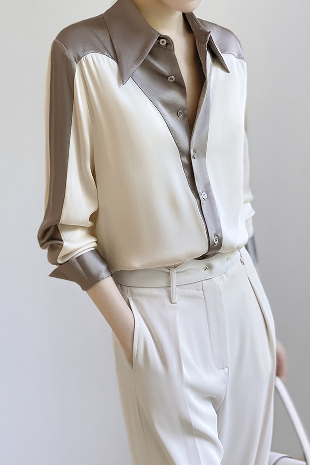 Shirt,featuring color-block paneled design,lapel + button placket for simplicity and neatness,drapey and textured fabric,loose and comfortable version |