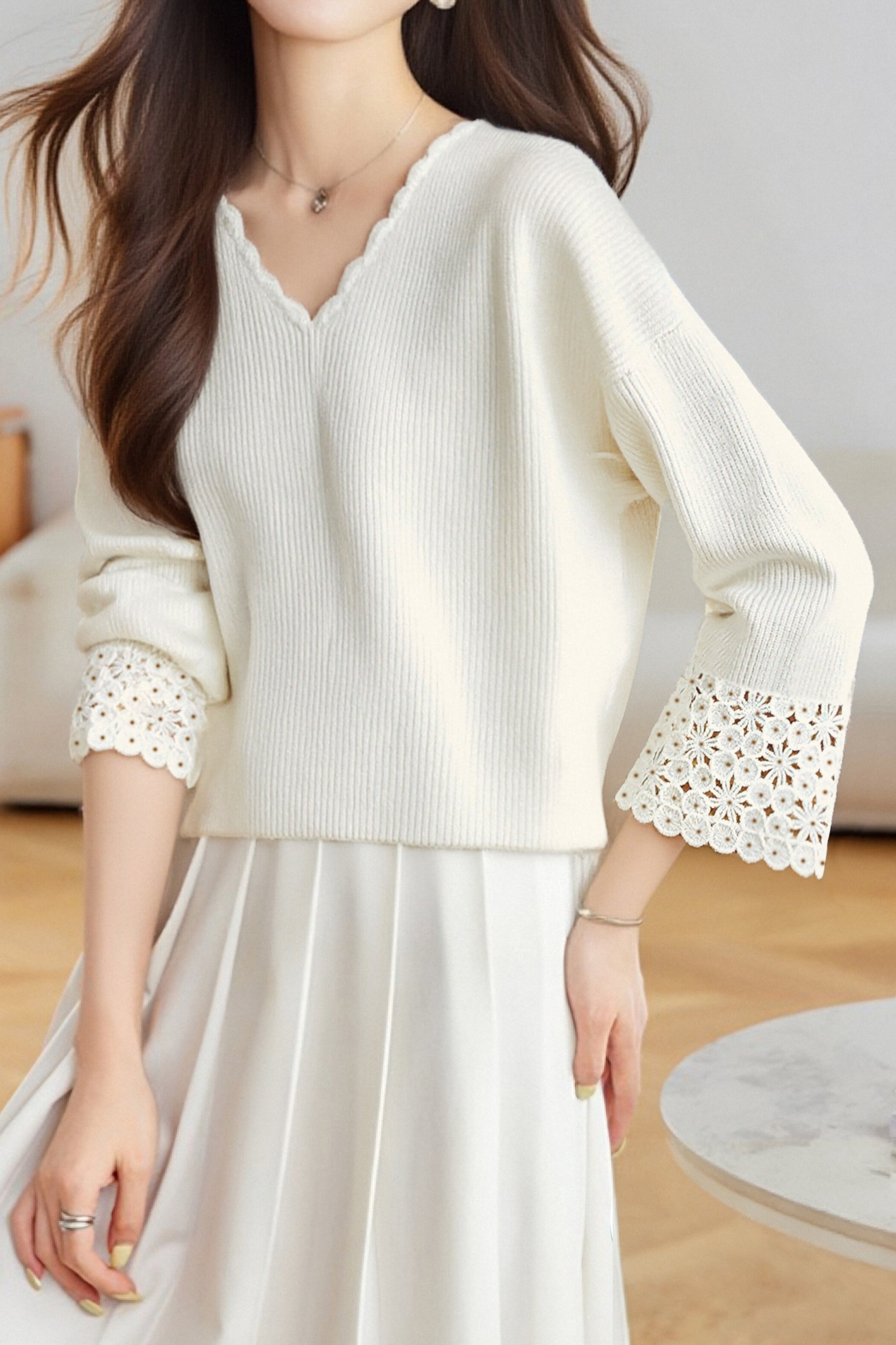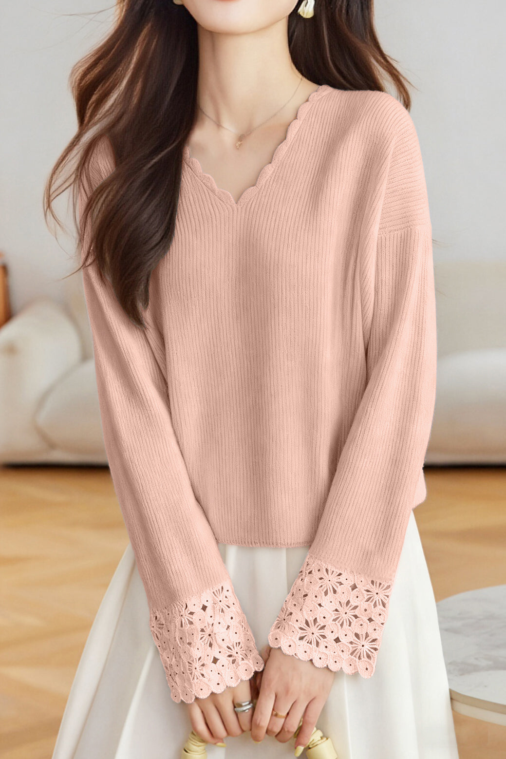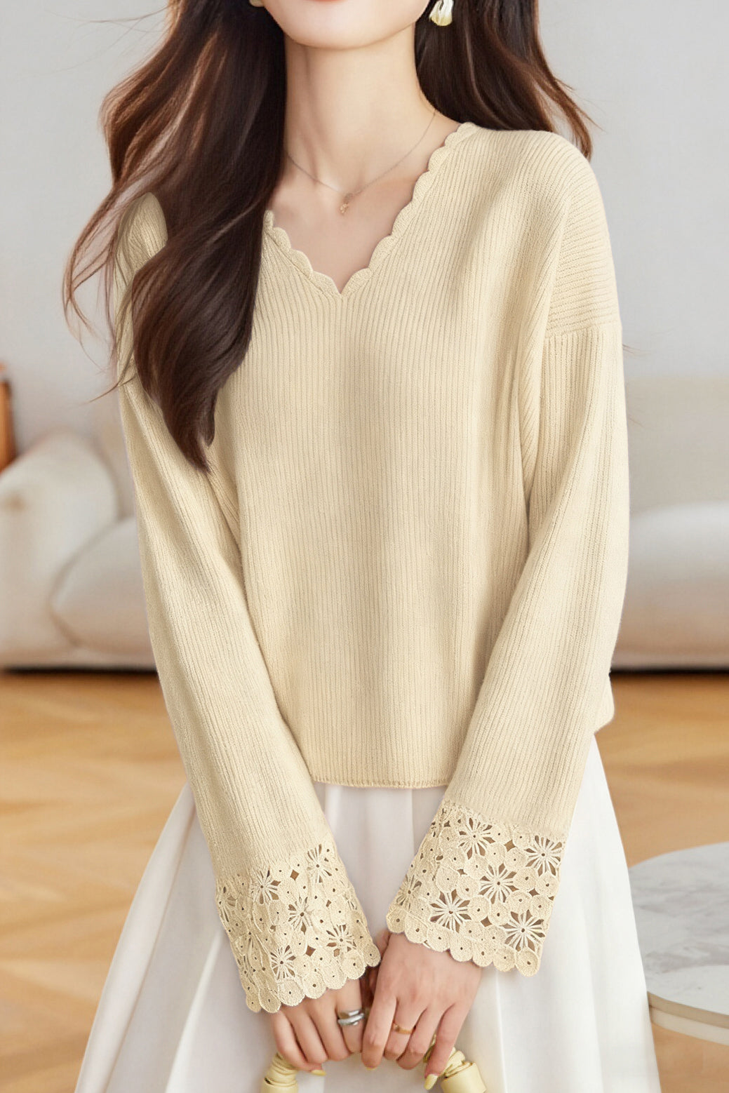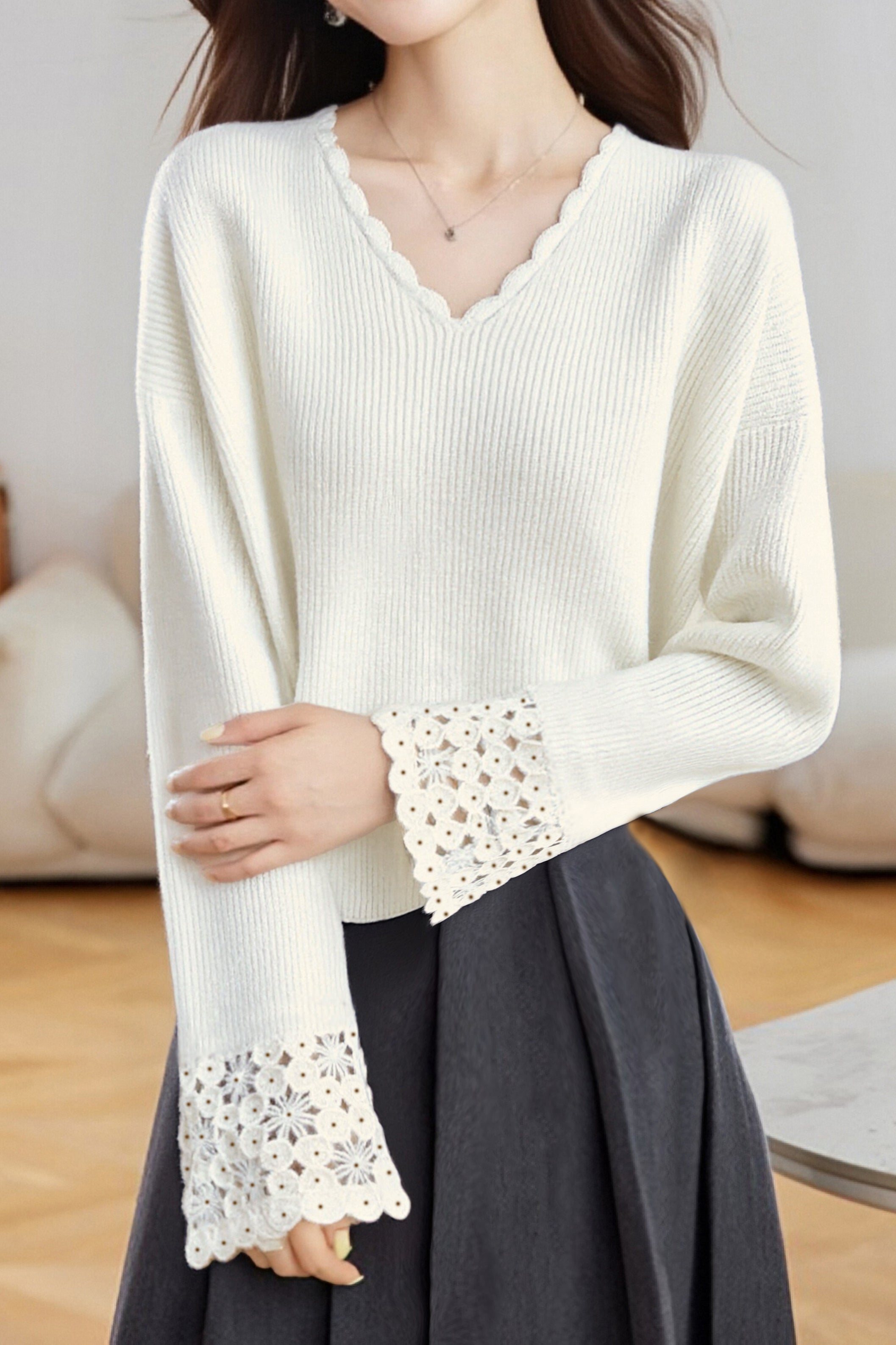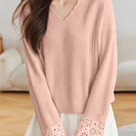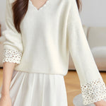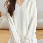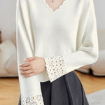 Pullover sweater,V-neck long-sleeve loose fit,cuffs with hollow-out design and neckline with wave lace decoration |