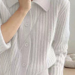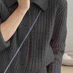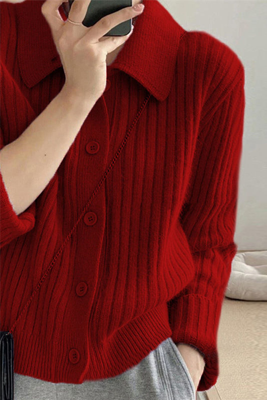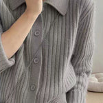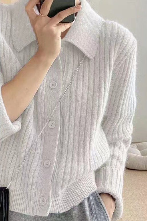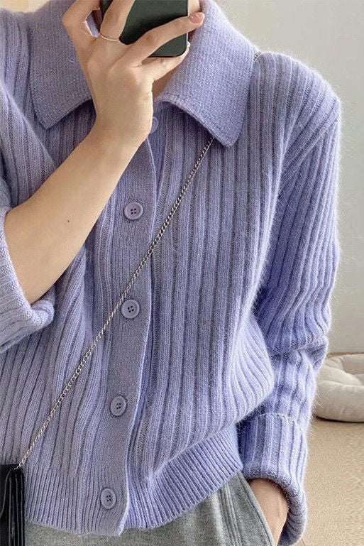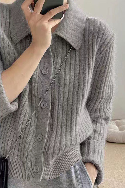 Knitted cardigan,shirt lapel long-sleeve loose fit,front placket buttons unbuttonable,body with ribbed texture |