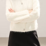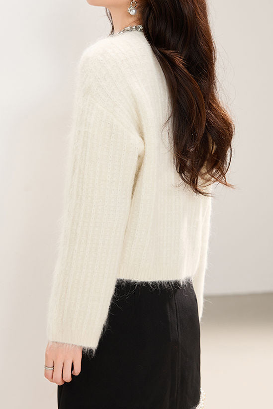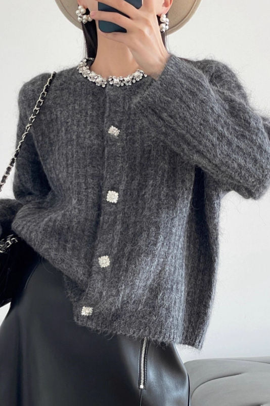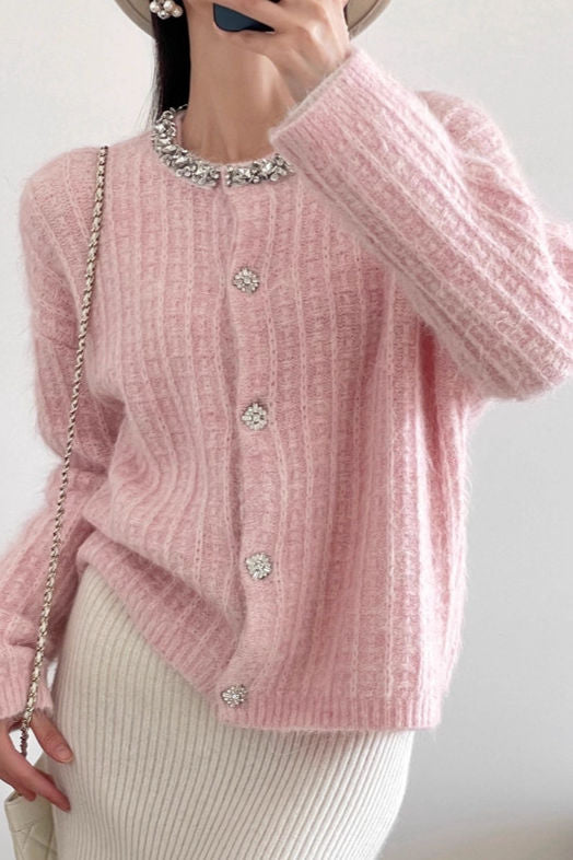 Casual Versatile Crew Neck Hot-Fix Rhinestone Knitted Cardigan
