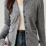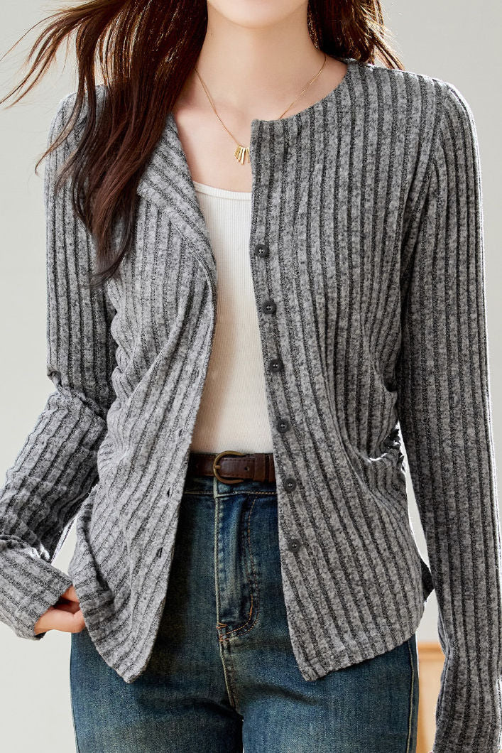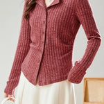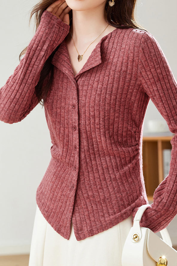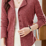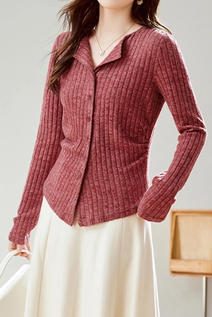 Cardigan,lapel long-sleeve slim fit,front placket buttons unbuttonable,full-body with solid-color knitted vertical chunky rib texture,ruched shape on both sides of the waist |