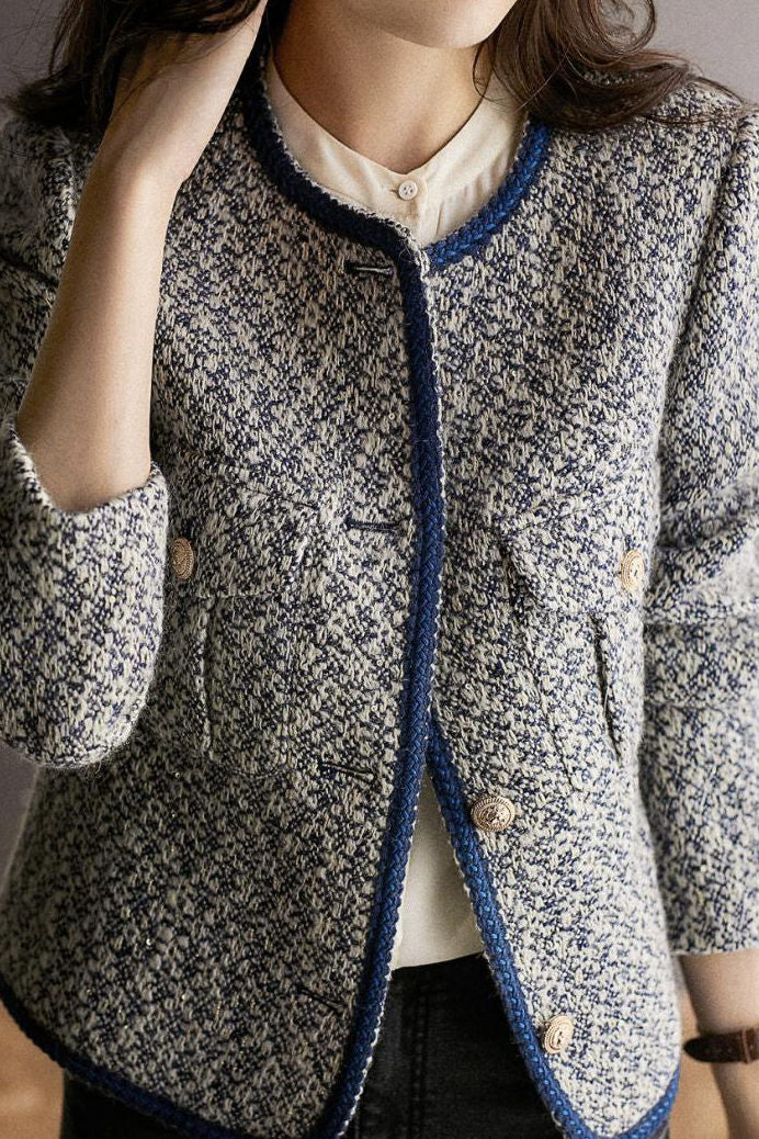 Coat,crew neck long-sleeve loose fit,front center with openable buttons,buttons and placket binding form color-block design with the body fabric,fabric with tweed craft and gold thread accents for a strong texture,two patch pockets on both sides |